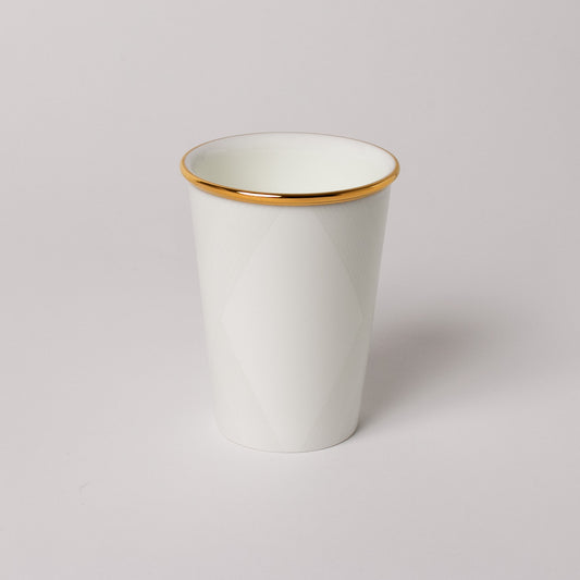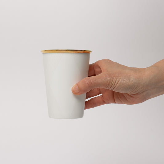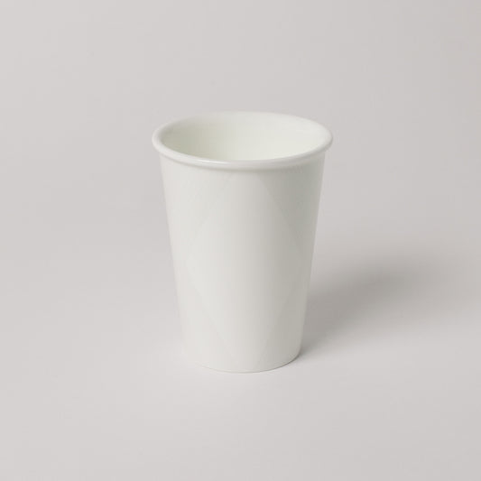 カップは紙コップを模った形状に繊細なレリーフを施し、NIKKO FINE BONE CHINA(ニッコーファインボーンチャイナ)ならではの白さが際立つ、ユニークで美しいカップです。