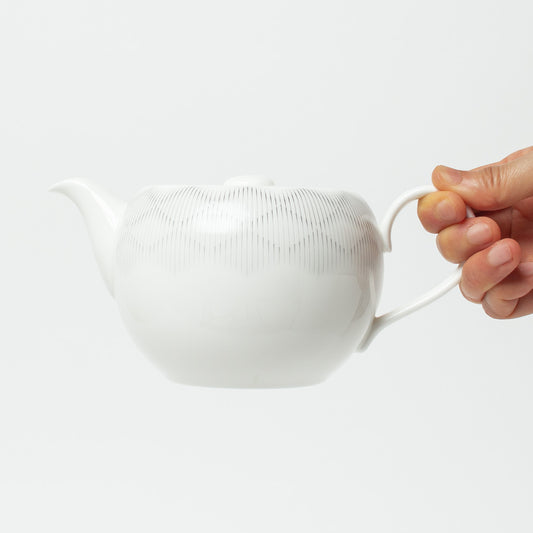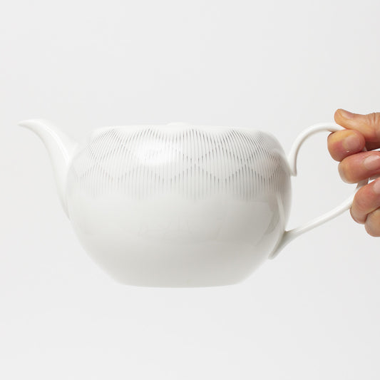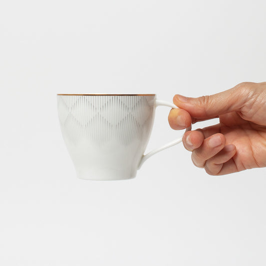 ソーサーに施された濃いグレーの絵柄が、淡いグレーの模様とコントラストをなし、異なるトーンの組み合わせがテーブルに心地よいリズムを生み出します。