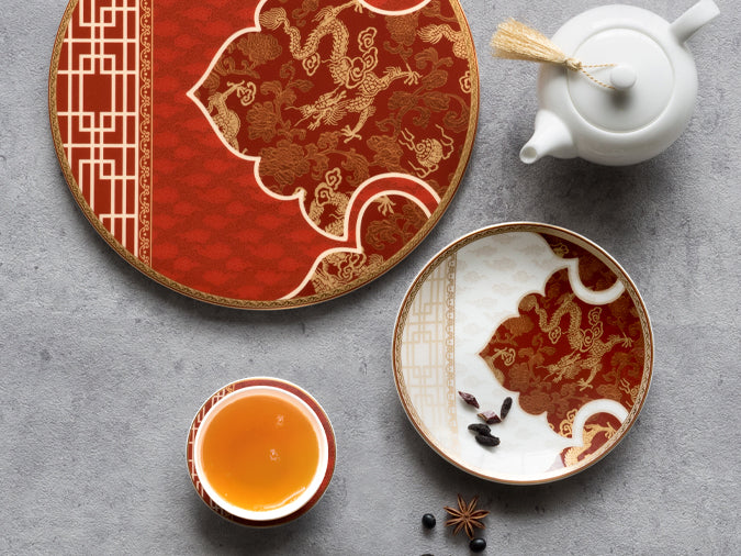 NOVEL DRAGON(ノーベル ドラゴン)シリーズは、古典的な吉祥文様と、中国格子を思わせるジオメトリックな文様などを組み合わせたモダンなデザイン。インパクトがあり、かつディティールにもこだわった繊細さを感じるモダンチャイニーズのシリーズです。縁起の良い「龍」や「牡丹」「雲文」のモチーフや、多様な金の表現が華やかな印象を与えます。