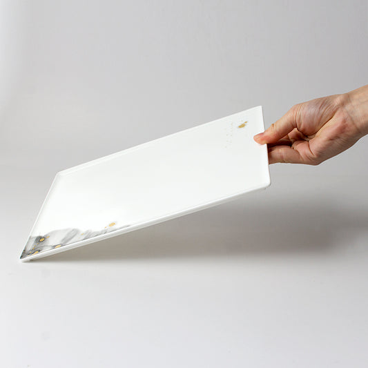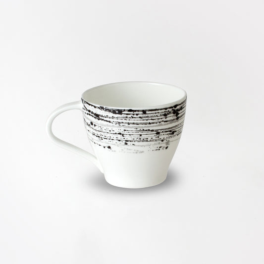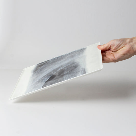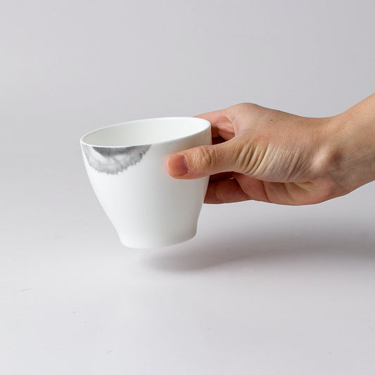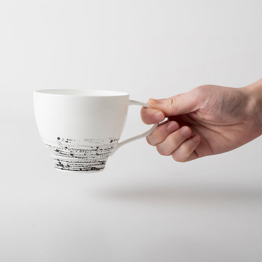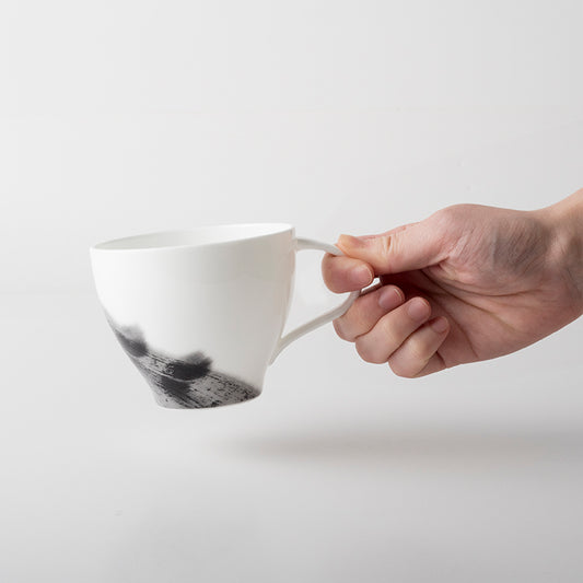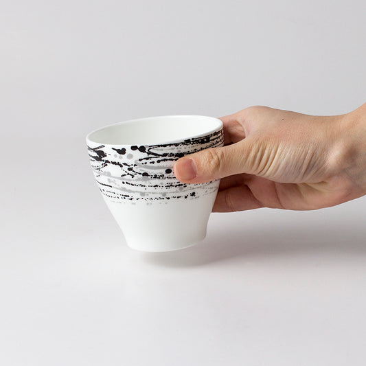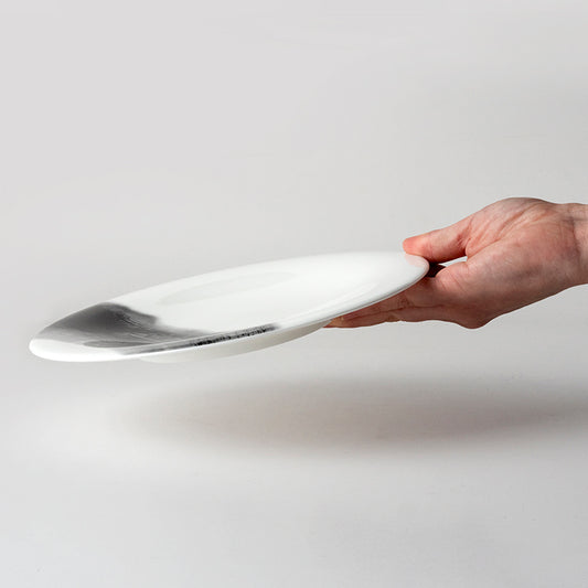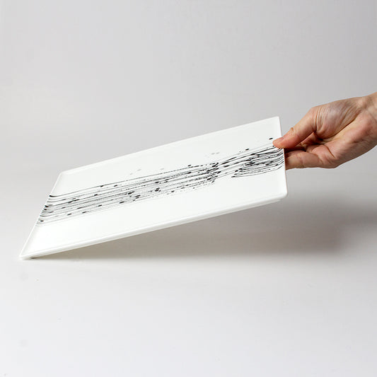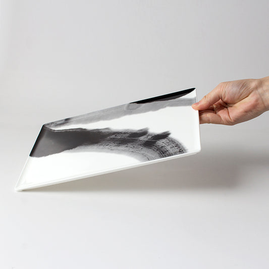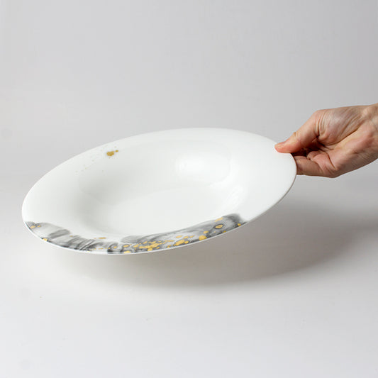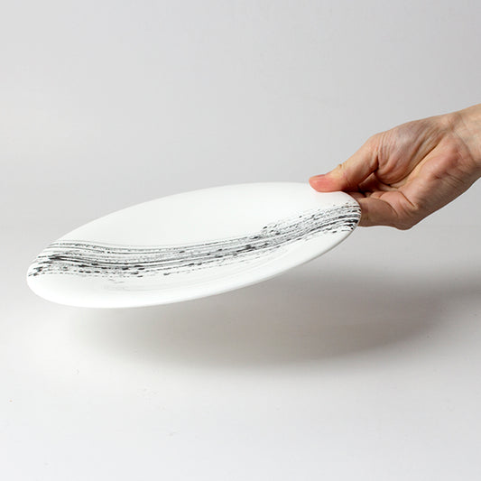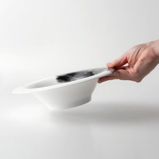 “いかにお料理を盛るか、シェフがインスパイアされるようなおもしろい器”というコシノヒロコ氏のコンセプトの元、製作されたシリーズです。コシノヒロコ氏が描いた墨の作品から作られた器は、原画の作品の勢いやスピード感、墨や絵の具のにじみや流れを活かしながら、日本の「間」の感覚が余白に表現されています。