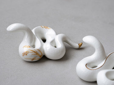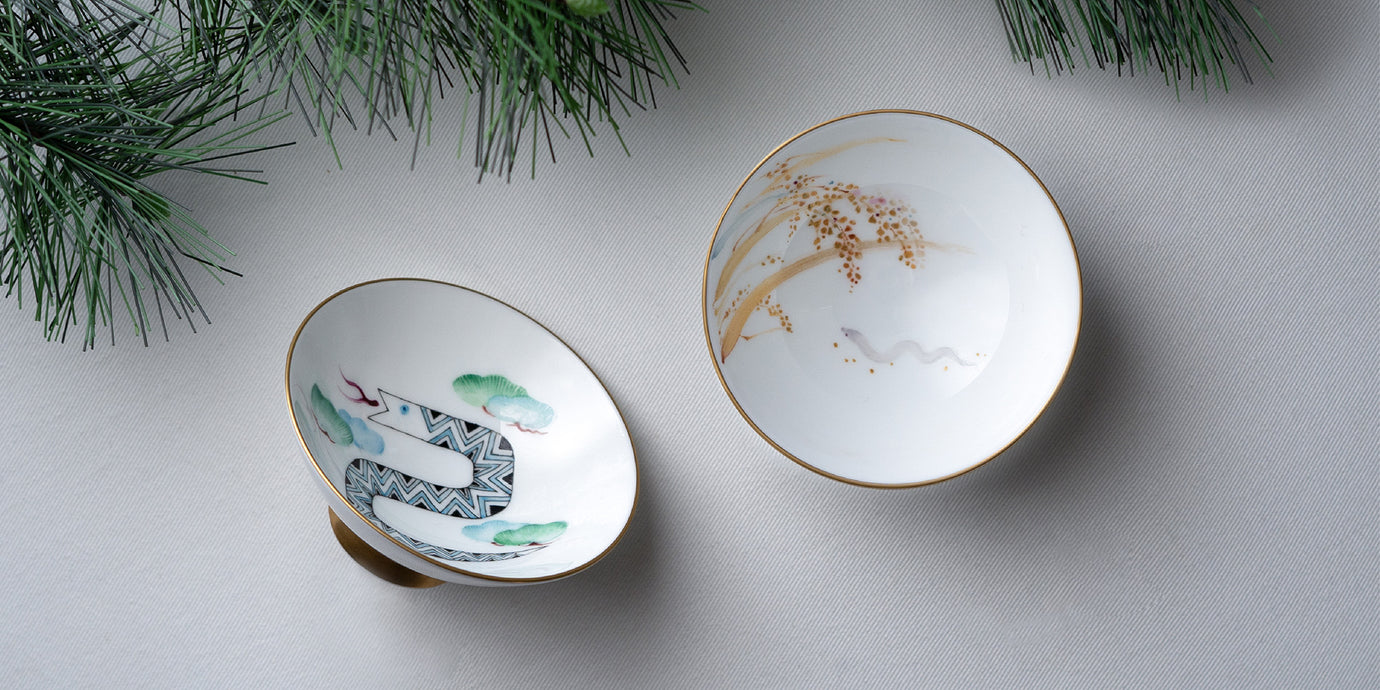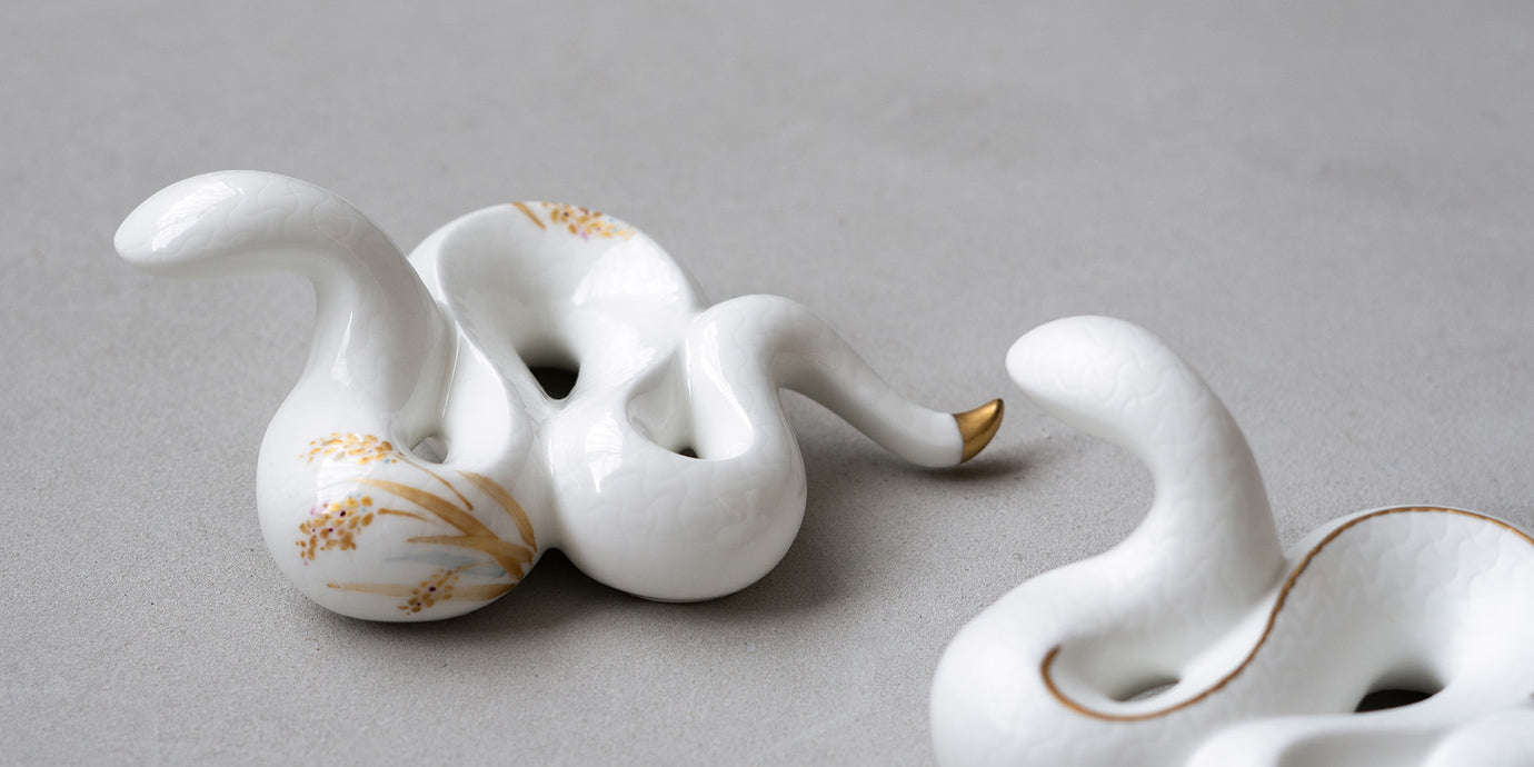 干支を模ったボーンチャイナ製のフィギュア。2025年の干支「巳(へび)」5種類のうち、3種類には招福絵が繊細にハンドペイントで描かれています。