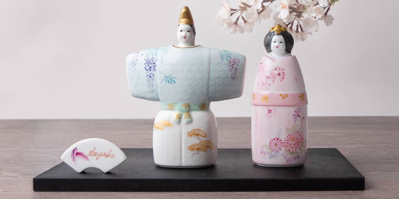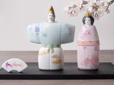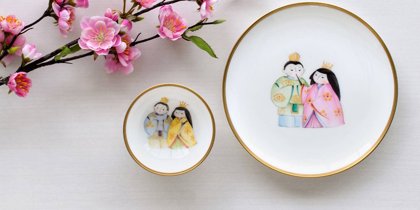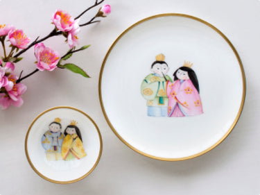 桃の節句にちなみ、お雛様の仲睦まじい姿が描かれた盃と15cmプレート。いつもおすましなお雛様の見た事のないラブラブな瞬間。ふと、どこかのカップルに見えてきそうではありませんか…。
