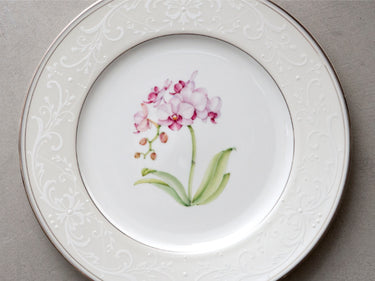一筆一筆ハンドペイントで描いたアートプレート。 格調高いパールの唐草模様で縁取った華やかなデザインは晴れの日の記念や大切な方への贈り物として最適な一品です。