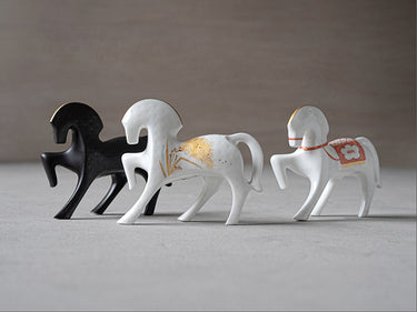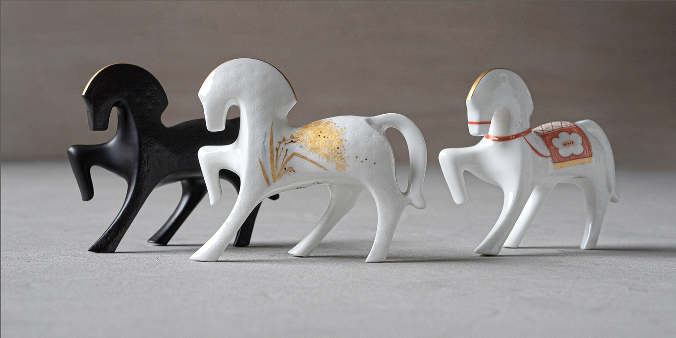 干支を模ったボーンチャイナ製のフィギュア。2026年の干支「午(うま)」5種類のうち、3種類には招福絵が繊細にハンドペイントで描かれています。