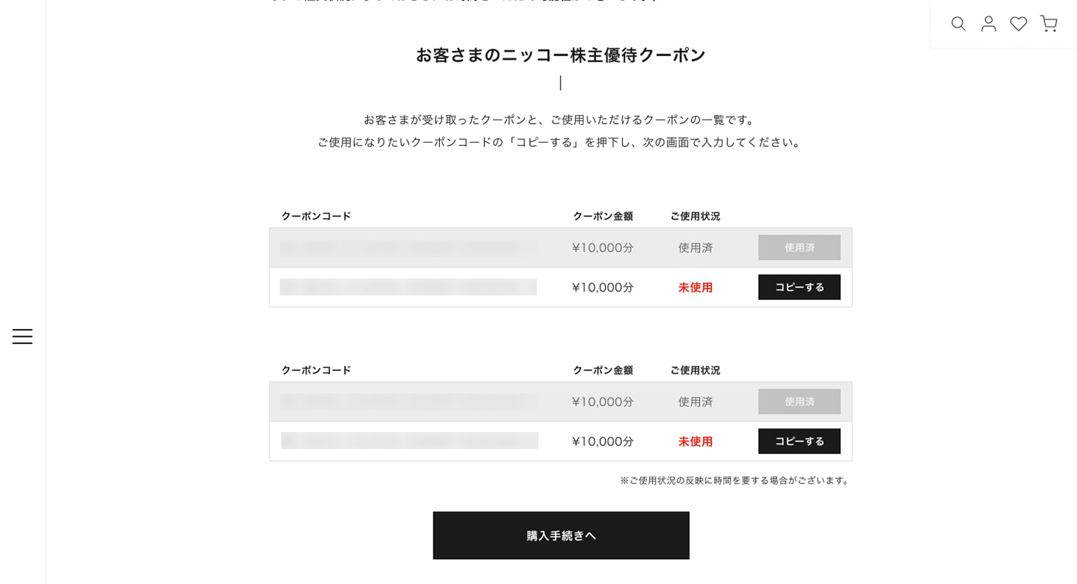 後日お買い物をする際にログイン後のマイページ内の「ニッコー株主優待特設ページはこちら」ボタンを押下し、本ページにアクセスしていただきクーポンコードをご確認ください。