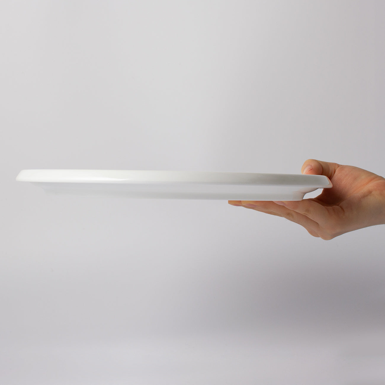 プレートのフラット面を最大限に広くし、 角度のついた短めのリム(ふち)がアクセントになり、 お料理を引き立ててくれるデザインになっています。