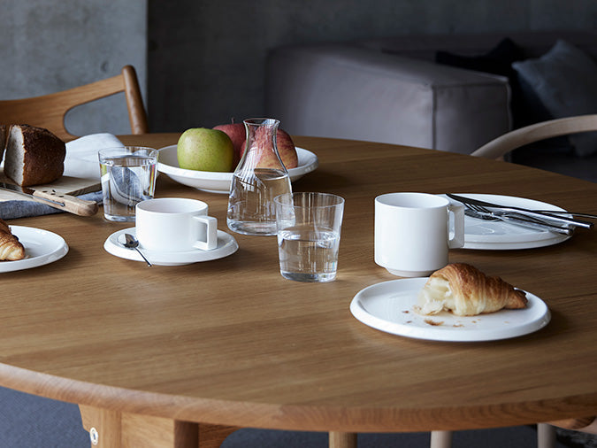 プレートのフラット面を最大限に広くし、 角度のついた短めのリム(ふち)がアクセントになり、 お料理を引き立ててくれるデザインになっています。