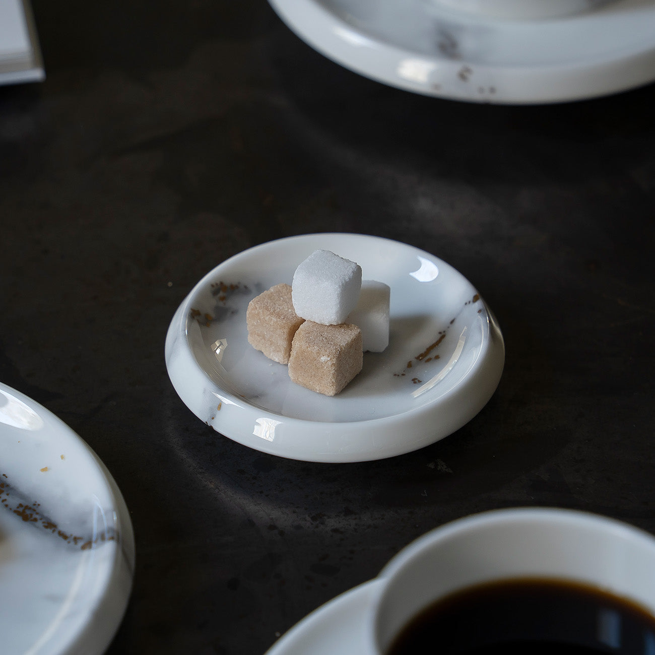 大理石(マーブル)模様に金彩が施された絵柄を、NIKKOのイングレーズ転写技術※によって、ファインボーンチャイナにディテールまで表現したシリーズです。