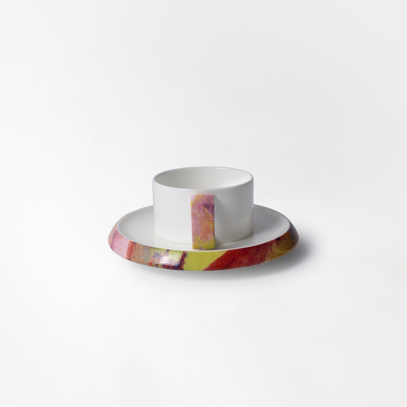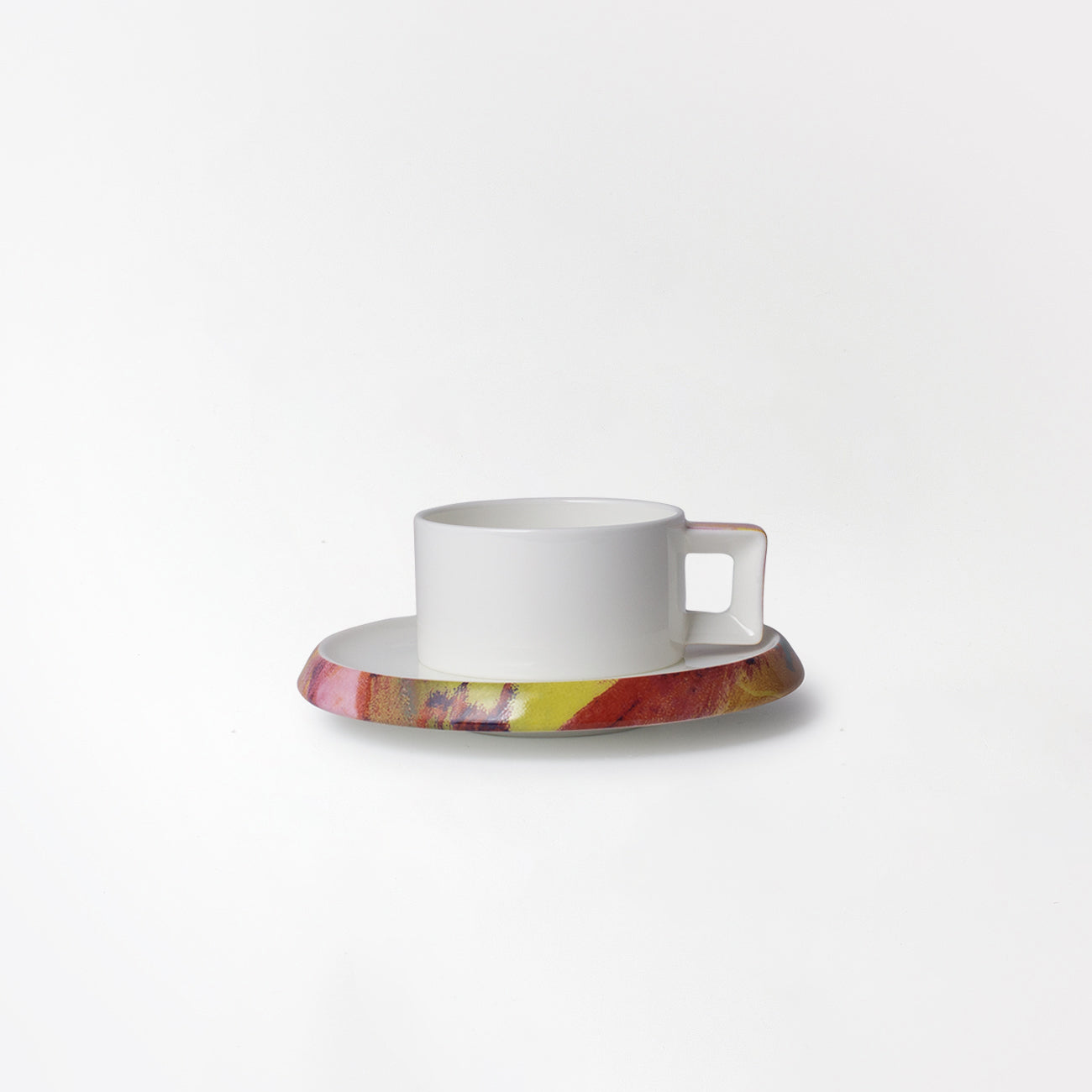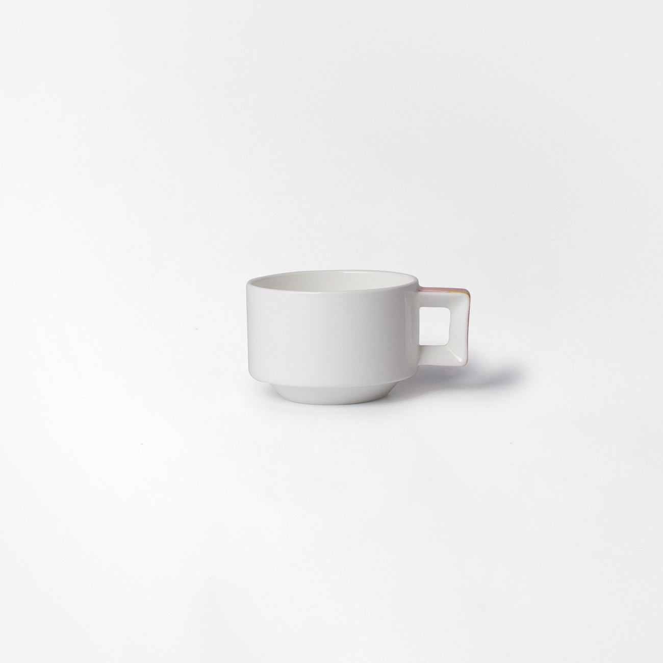 直線的なフォルムのエスプレッソ用の小さなカップ(満水時容量 約90cc)です。ハンドル部分に絵柄が施されています。
