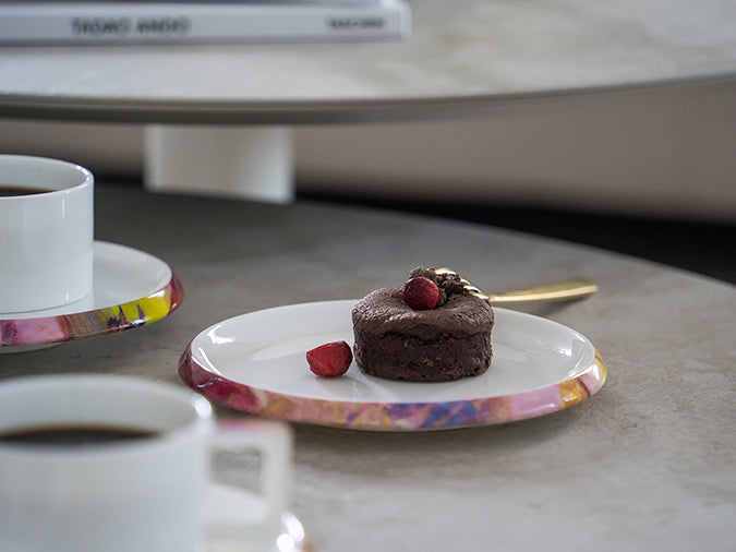 満水時容量 約350ccのマグと9.5cmプレートのセットです。プレートをマグのフタとして使用すれば、保温効果が高まり温かいお飲み物をゆっくりとお楽しみいただけます。プレートはブレイクタイムのスイーツの小皿として、角砂糖などのコンディメント入れ、ティーバック置きとしてもお使いいただけます。