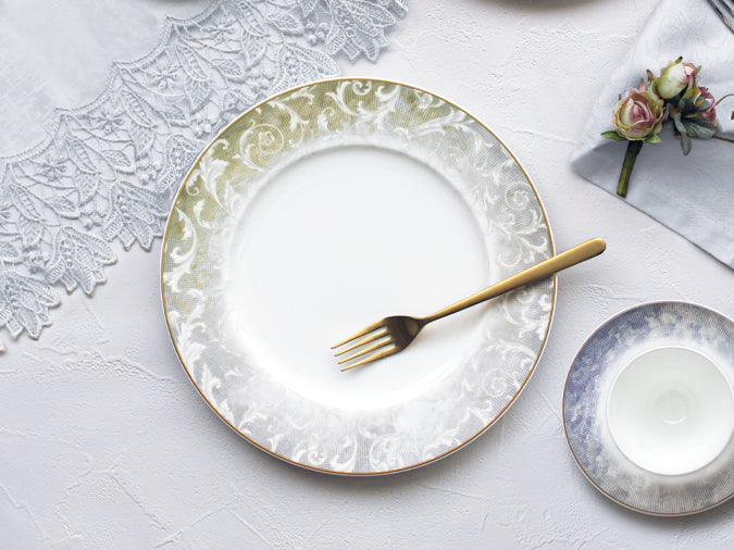 モダンな邸宅の食卓をイメージして制作されました。唐草模様は、繁栄や長寿を象徴する縁起の良い文様のため、お祝いの席やご結婚の贈り物にも最適です。