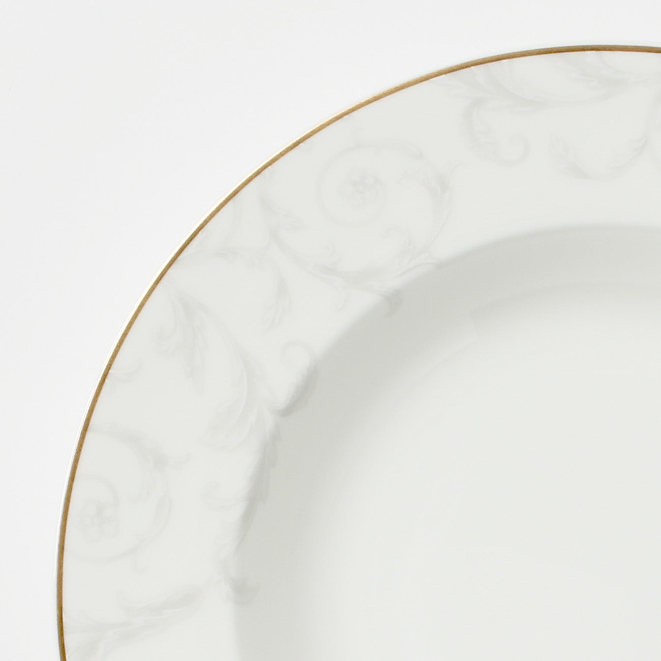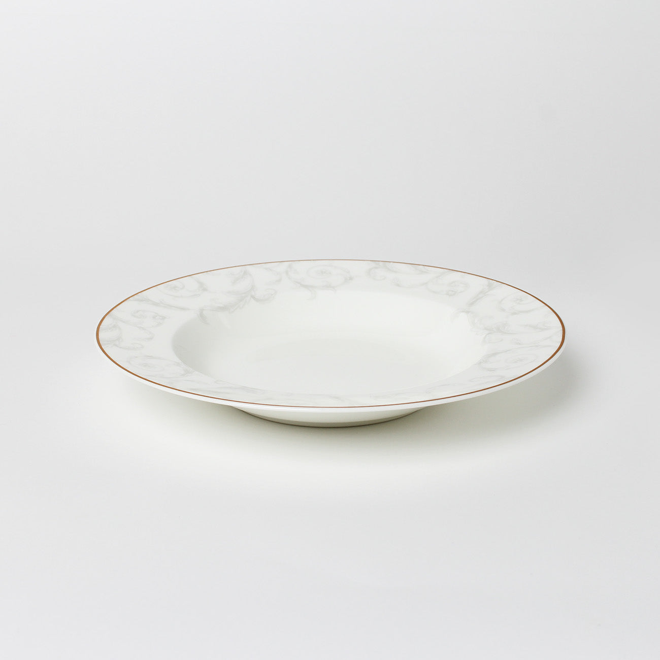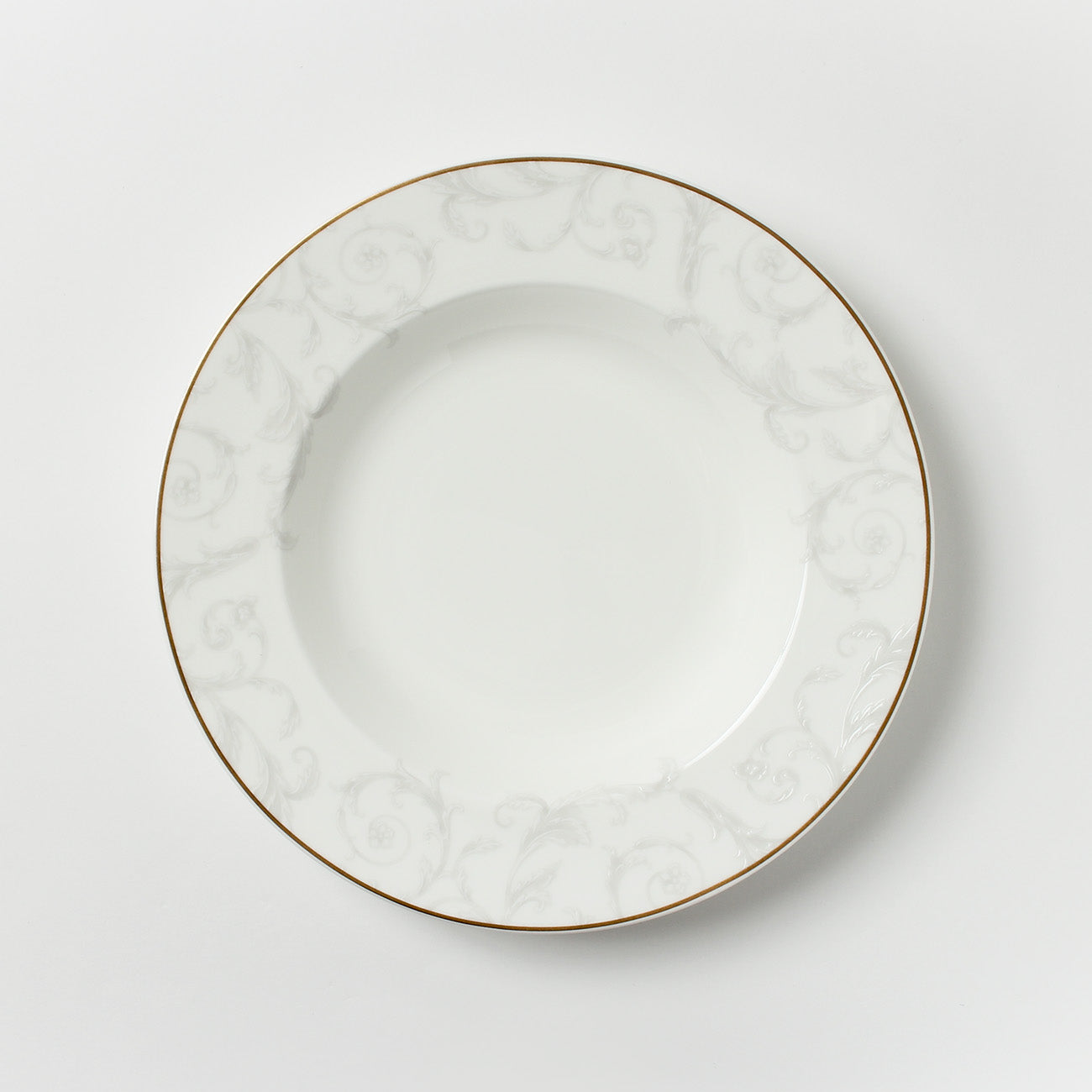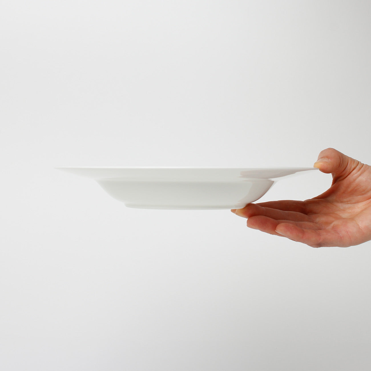 リム付きのスープ皿。スープ皿としてはもちろん、パスタやカレーなど汁気のあるメニューにも幅広くお使いいただけるプレートです。
