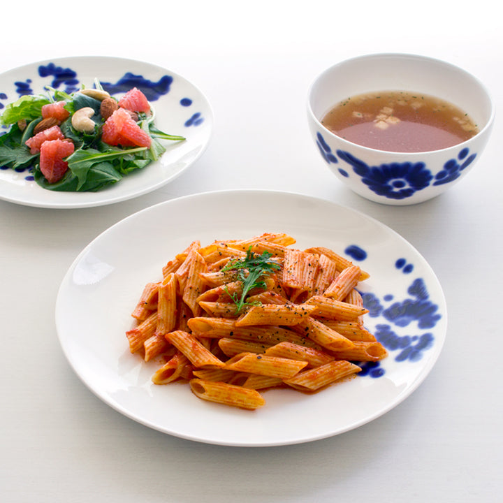 食卓から舞い上がる花ばなを描いています。自然なにじみと不揃いなタッチも、彼女のこだわり。アイテム毎にデザインが違うので、いろいろな組み合わせをお楽しみいただけます。