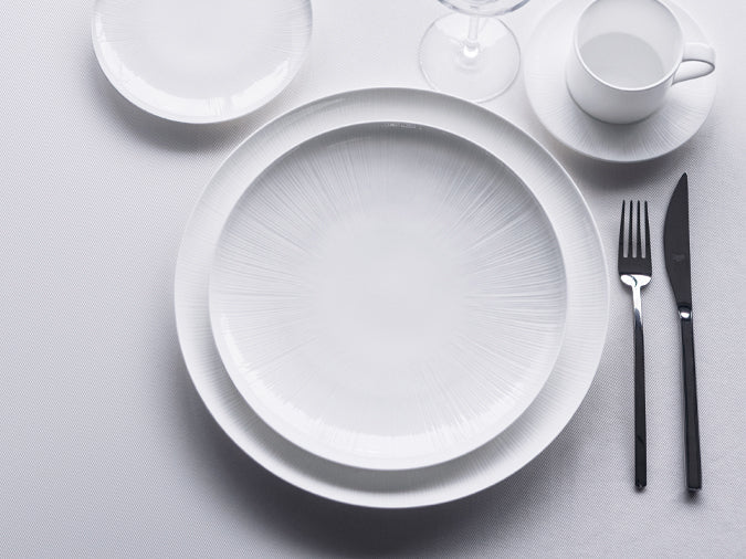 リムのないクープのシェイプはスプーン・フォーク・お箸でも使いやすい形で、お料理のジャンルを問わずお使いいただけます。放射状のレリーフがシャープにお料理を一層引き立て、お料理ビギナーの方にもおすすめのシリーズです。