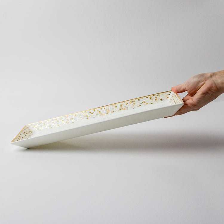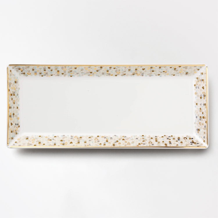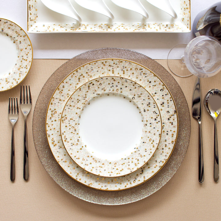 マットと光沢の質感の違いで、立体感を感じるスパンコールのデザイン。ゴールドとプラチナが光の反射でキラキラと輝きます。スパンコールの上品なきらめきが、テーブルに華やかな特別感を与えます。