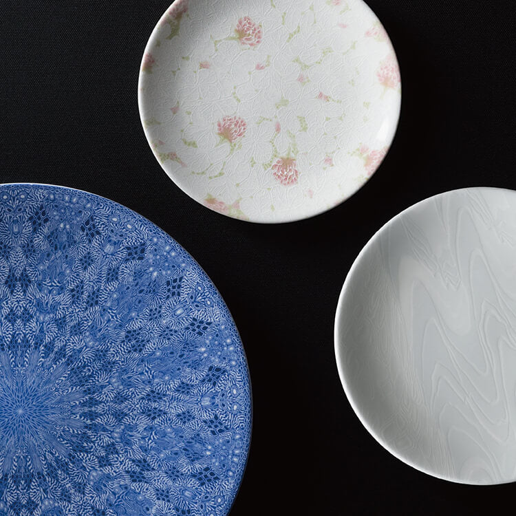 透光性のある練り込み作品で世界的に有名な陶芸家ドロシー・ファイブルマン。その緻密で繊細なドロシー・ファイブルマン作品のディテールを、ニッコーのイングレーズ転写技法※によって、ファインボーンチャイナに表現しました。