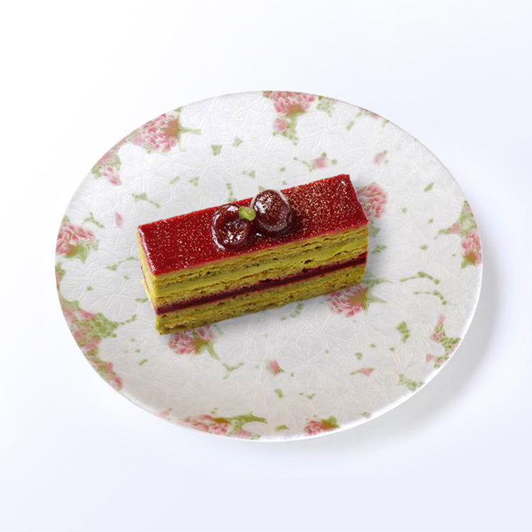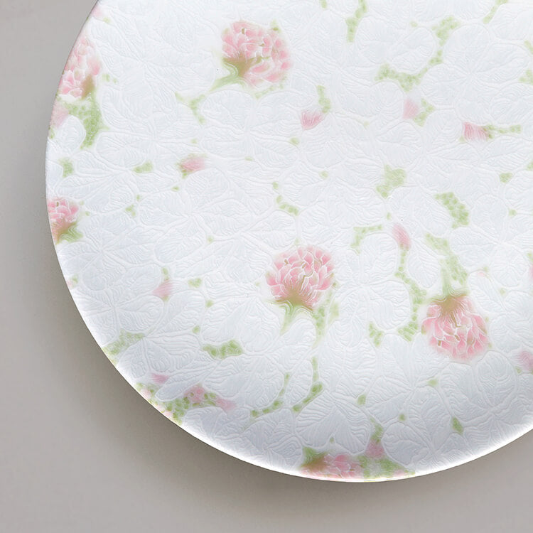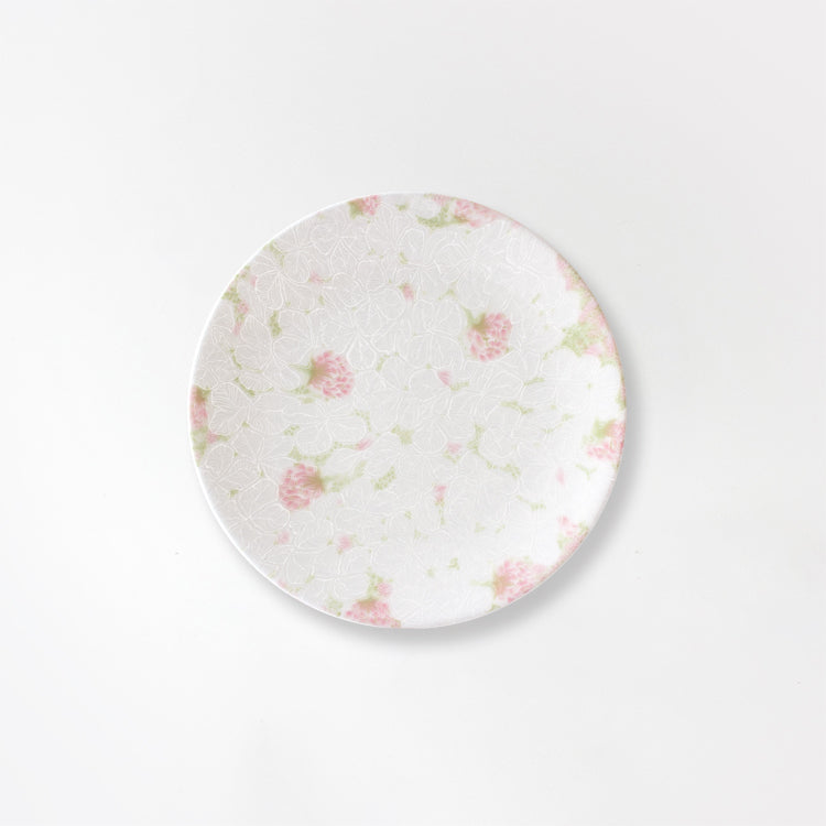 光にあたると白いクローバーの葉の絵柄が浮かび上がります。朝食やティータイムなど、自然光のあるシーンにおすすめのシリーズです。18cmプレートは、ケーキ皿や取り皿などご家庭で便利にお使いいただけるサイズです。