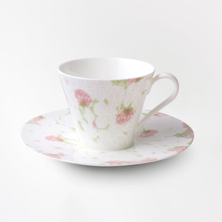 光にあたると白いクローバーの葉の絵柄が浮かび上がります。自然光が降り注ぐ朝食やティータイムにおすすめのカップ&ソーサー(ハマありタイプ)です。■CLOVER(クローバー)シリーズ