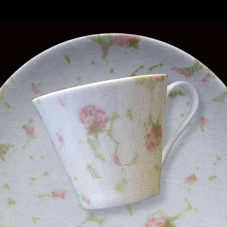 透光性のある練り込み作品で世界的に有名な陶芸家Dorothy Feibleman。その緻密で繊細なDorothy Feibleman作品のディテールを、ニッコーのイングレーズ転写技法※によって、ファインボーンチャイナに表現しました。