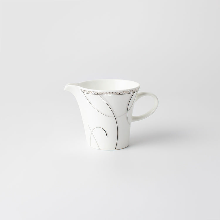 ボーンチャイナの純白のなめらかな素地にパールグレーと黒のシックなたたずまい。