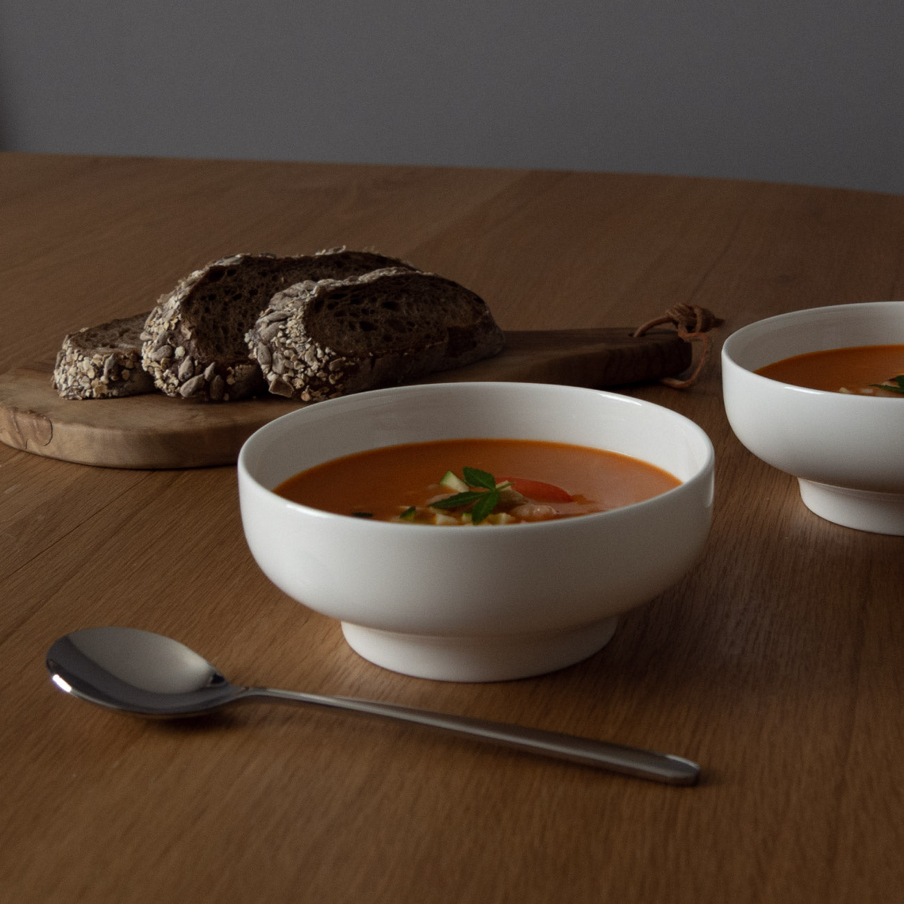 高台が高めにデザインされたモダンなシェイプのボールです。スープやデザートの器としてお使いいただけます。