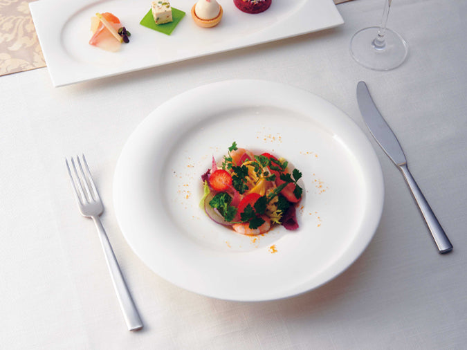 水の流れをイメージしたデザインのリムが特長的なプレートです。おもてなしの前菜やピンチョス、お寿司など小さめのお料理を並べて盛り付けるのにおすすめです。
