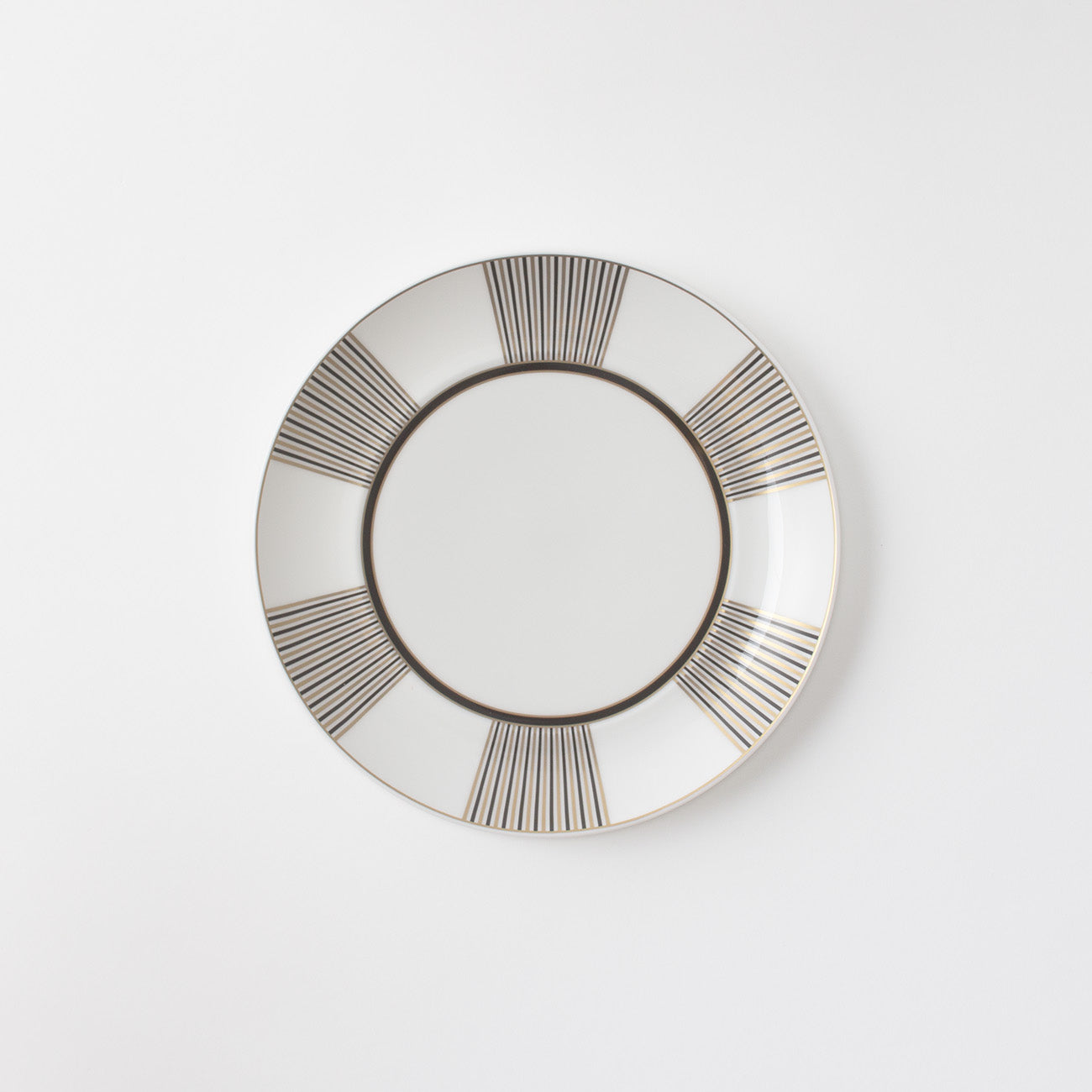 黒と金彩のストライプが華やかなデザインです。ケーキ皿や取り皿に便利なサイズのプレートです。