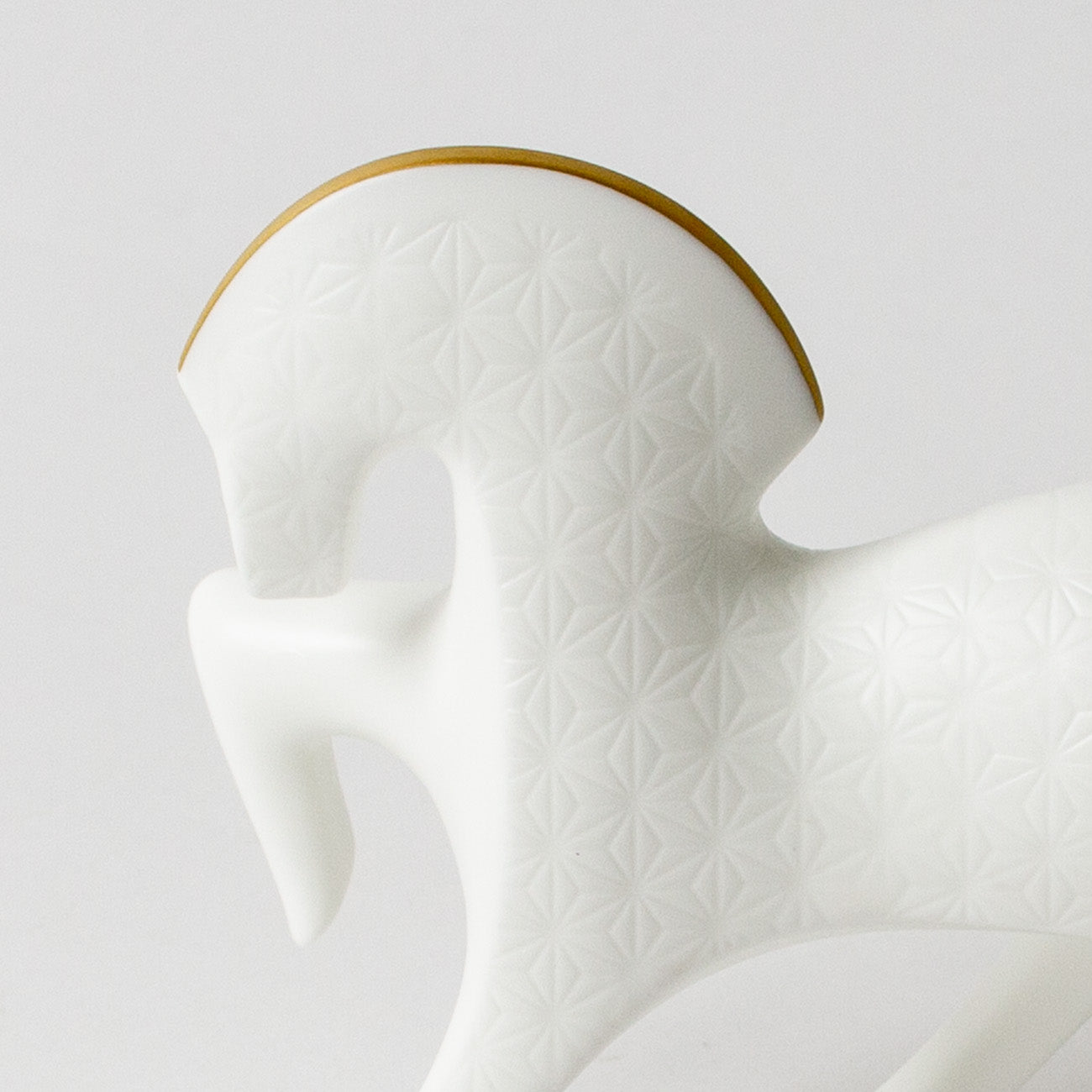 ボーンチャイナ製の素地には吉祥文様・麻の葉が彫り込まれ、たてがみには金彩が施されています。