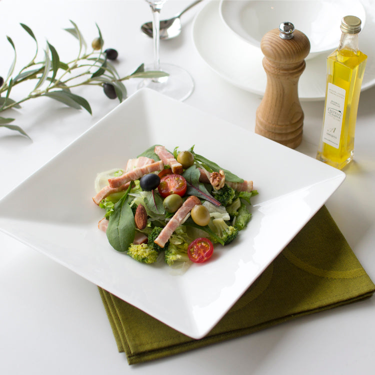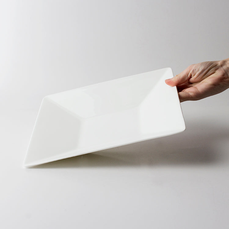 レリーフなしのシャープな形状のスクエアトレー。リムが大きくテーブルをモダンな雰囲気に演出します。メイン料理の盛り付けや、サラダなどの盛皿としてもおしゃれにお使いいただけます。