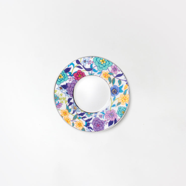 小さなデミタスカップのソーサーです。NIKKO FINE BONE CHINAの白地に鮮やかな色彩で描かれた花たちが踊ります。 フチの外側と内側にプラチナのラインが施されています。