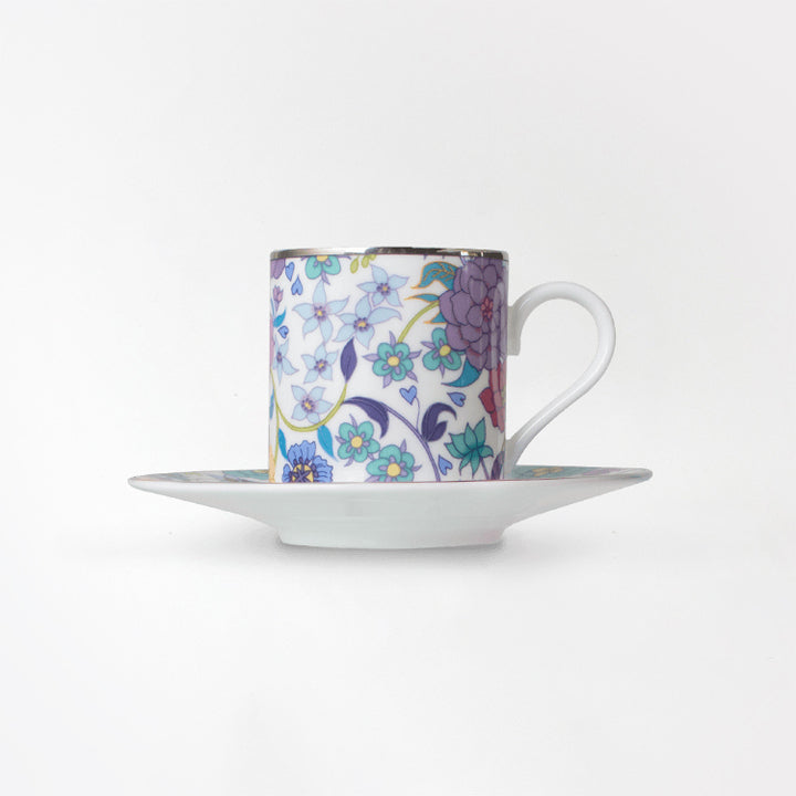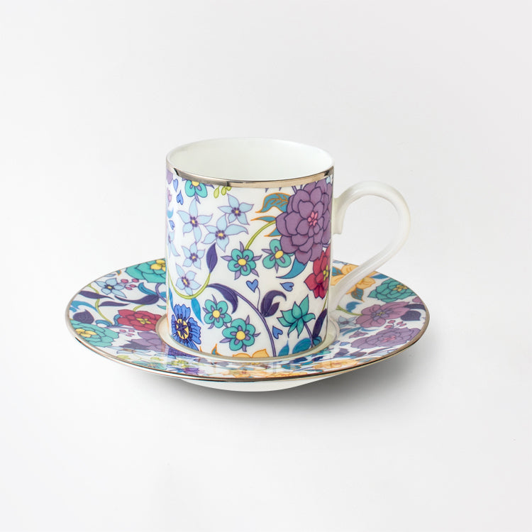 NIKKO FINE BONE CHINAの白地に鮮やかな色彩で描かれた花たちが踊ります。フチにプラチナのラインが施された小さなエスプレッソ用のカップ&ソーサー(満水時容量 約130cc)です。