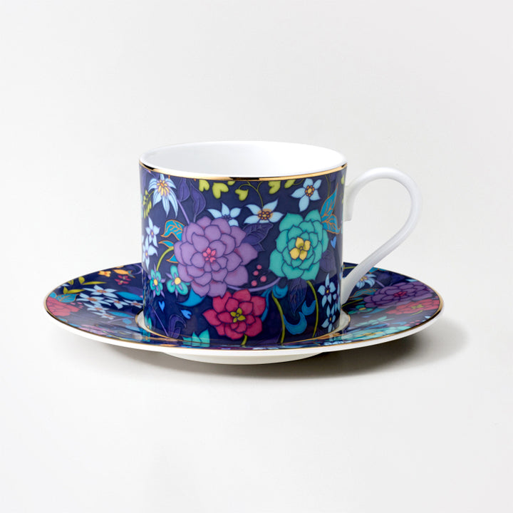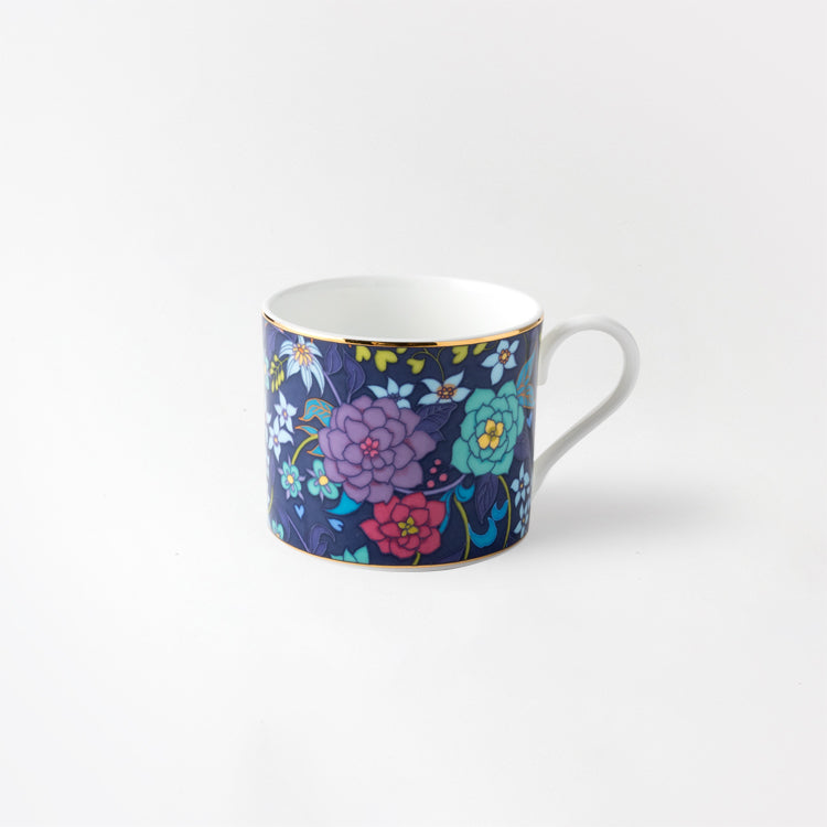 深い青地に鮮やかな色彩で描かれた花たちが浮かび上がります。カップのふちに金彩のラインが施された華やかなカップ(満水時容量 約250cc)です。
