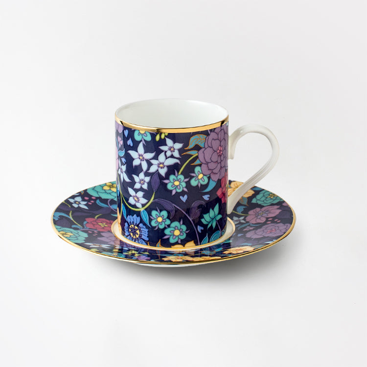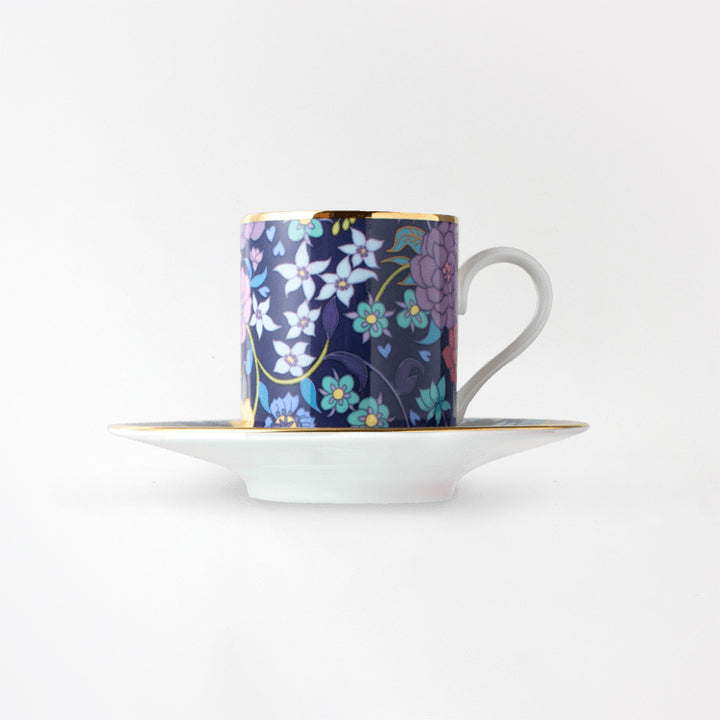 深い青地に鮮やかな色彩で描かれた花たちが浮かび上がります。フチに金彩のラインが施された小さなエスプレッソ用のカップ&ソーサー(満水時容量 約130cc)です。