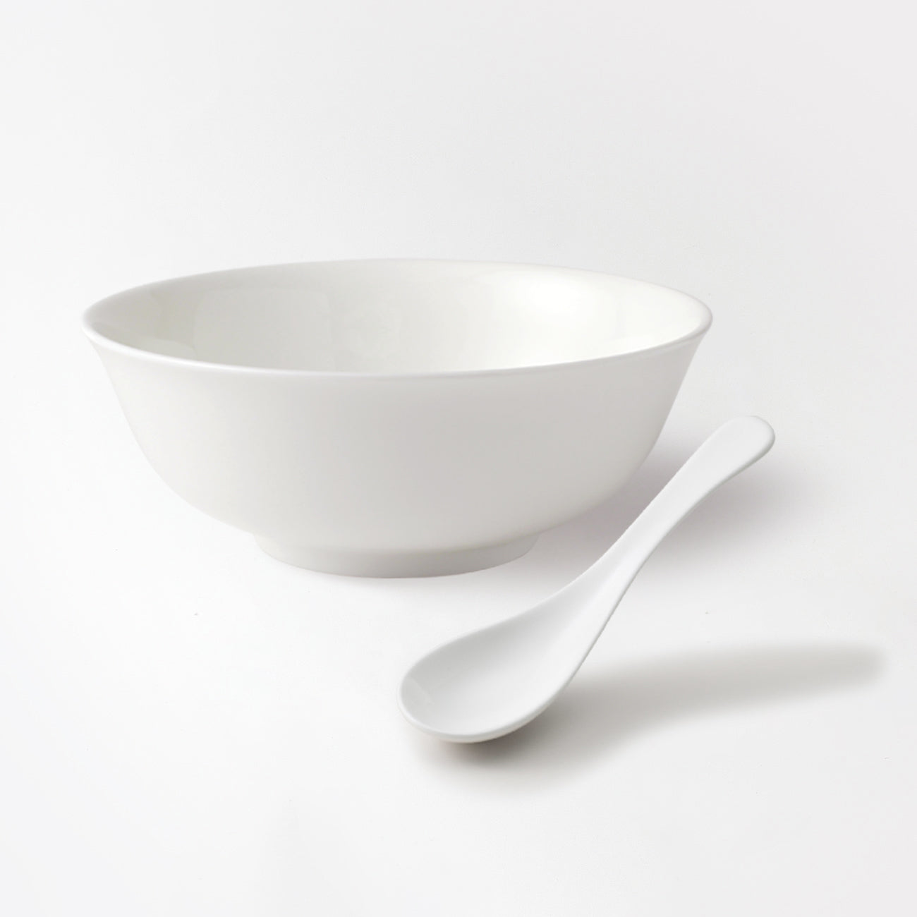 ボーンチャイナのなめらかな口当たりが人気の14cmスープスプーンと19cm麺丼のセット。19cm麺丼は、ご家庭で使いやすいスタンダードな大きさの中華どんぶりです。 浅めのカタチなので、具材を綺麗に盛り付けることができます。