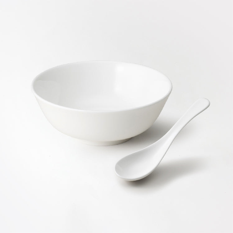 ボーンチャイナのなめらかな口当たりが人気の14cmスープスプーンと17cm麺丼のセット。17cm麺丼は、やや小さめの中華どんぶりです。満水時容量 約770cc。