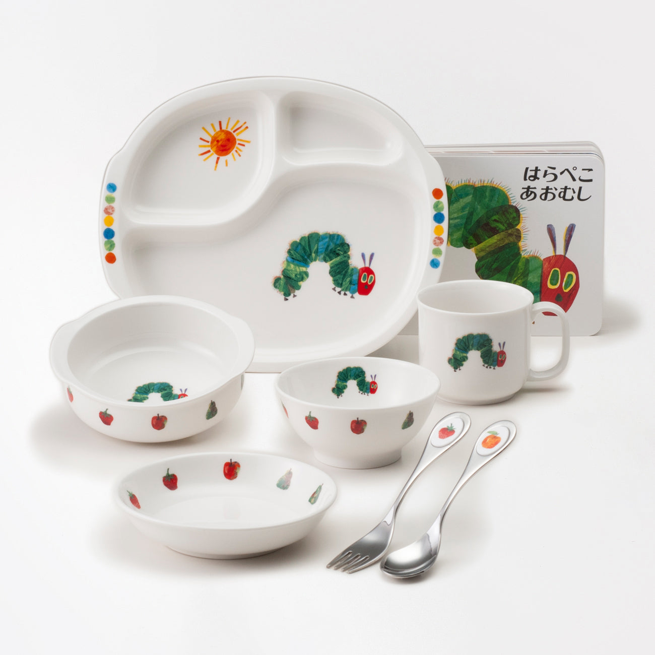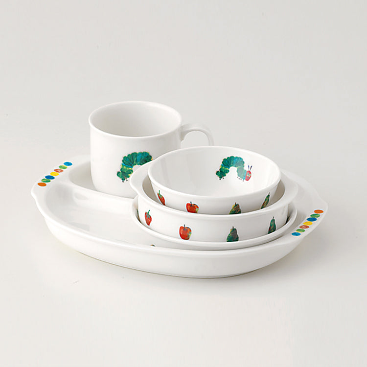 世代を超えて読み継がれる名作 エリック・カールの「はらぺこあおむし」がモチーフ。絵本もセットになっていて、出産祝いのギフトにもおすすめ。プレート類は、仕切付のランチ皿と深みのある取皿サイズがセットになっているので、お子様の成長に合わせいろいろなメニューに対応できます。13cm小鉢は、深さがしっかりありスプーンなどですくいやすい形です。