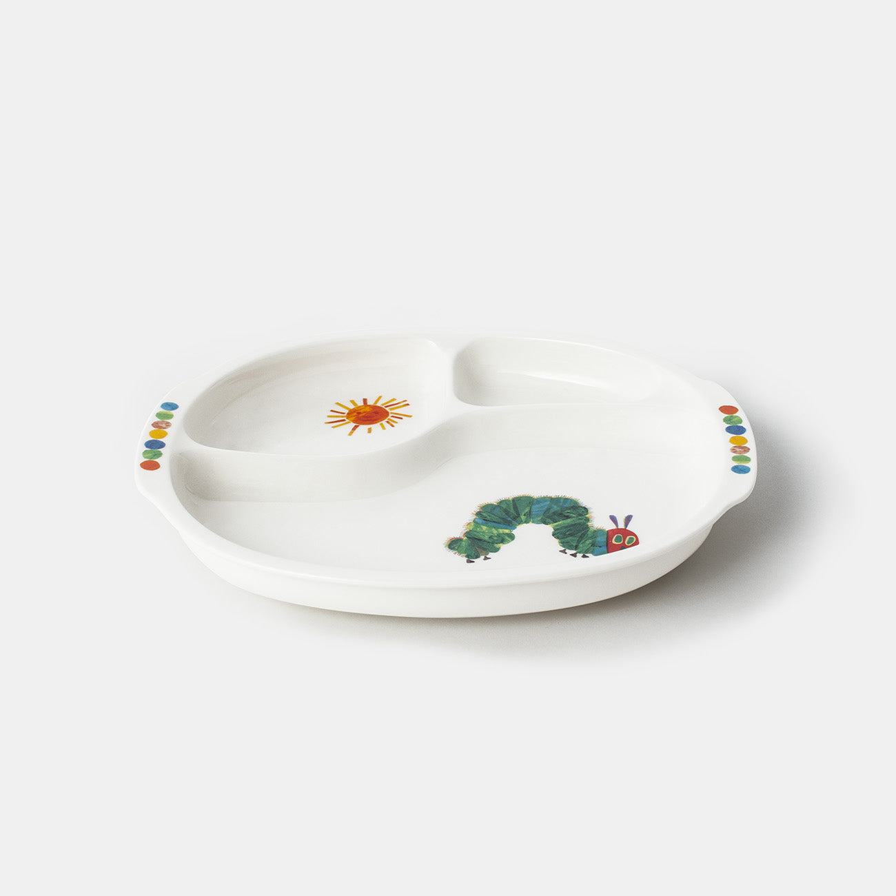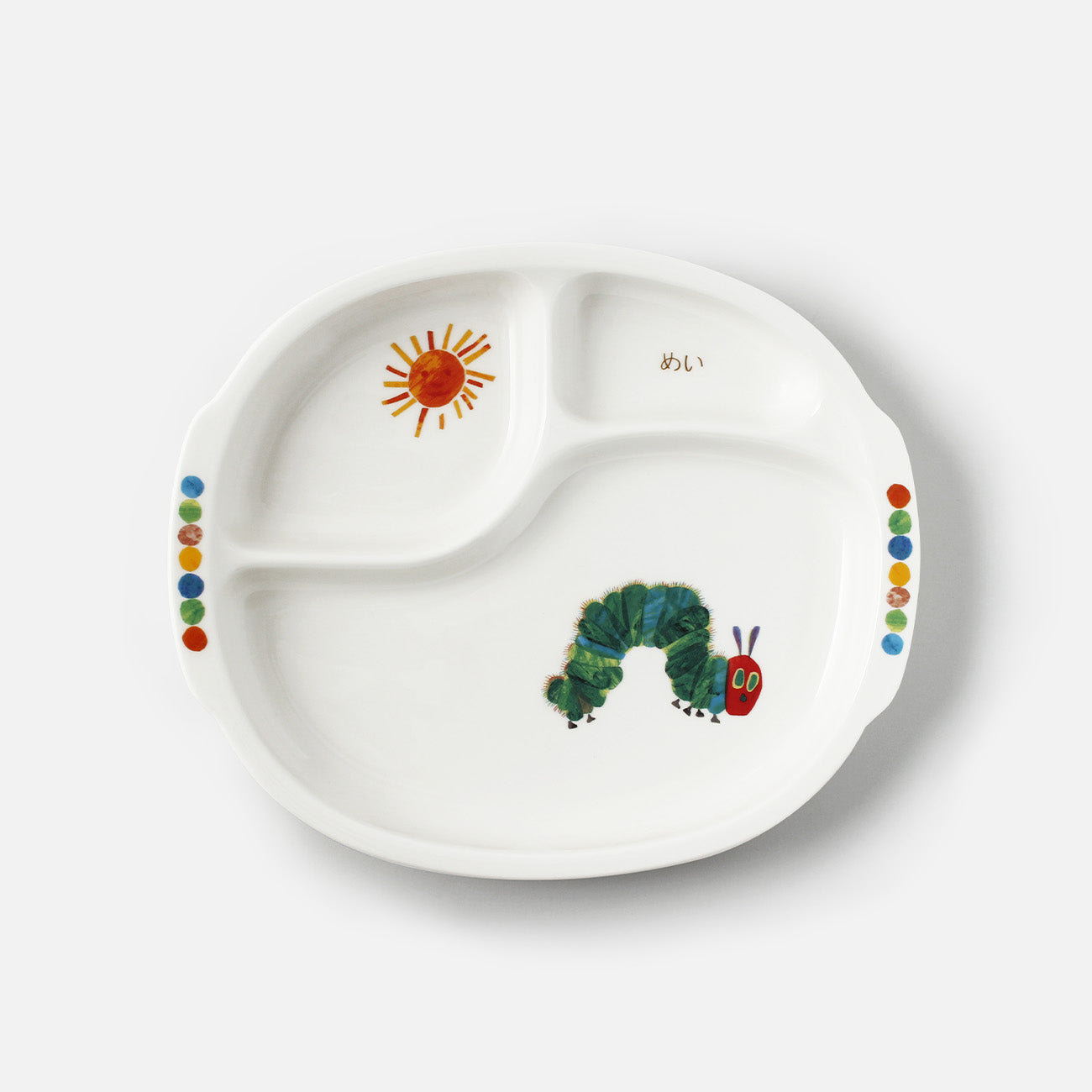 世代を超えて読み継がれる名作 エリック・カールの「はらぺこあおむし」がモチーフ。「はらぺこあおむし」のようにもりもり食べて、元気に大きく育って欲しいという願いも込もった食器です。栄養管理もしっかりできる強化磁器製の仕切皿。3つに分かれたプレートに主菜と副菜を盛り付ければ、きちんと栄養バランスよい食事ができあがり。三角食べが自然に身につけられます。