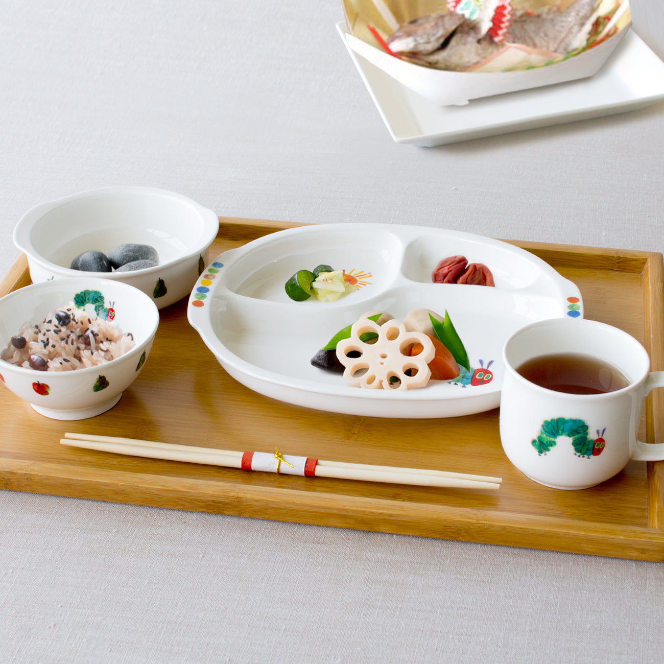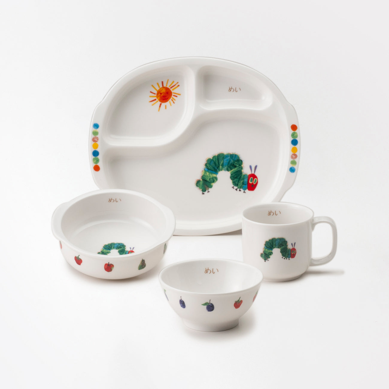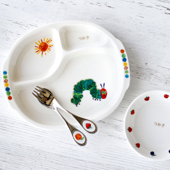 エリック・カールの名作「はらぺこあおむし」がモチーフ。出産祝いのこだわりギフトに、名入れ食器のセットはいかがでしょう。自分の名前の入った食器は、お子様のものを大切にする心をいっそう育みます。