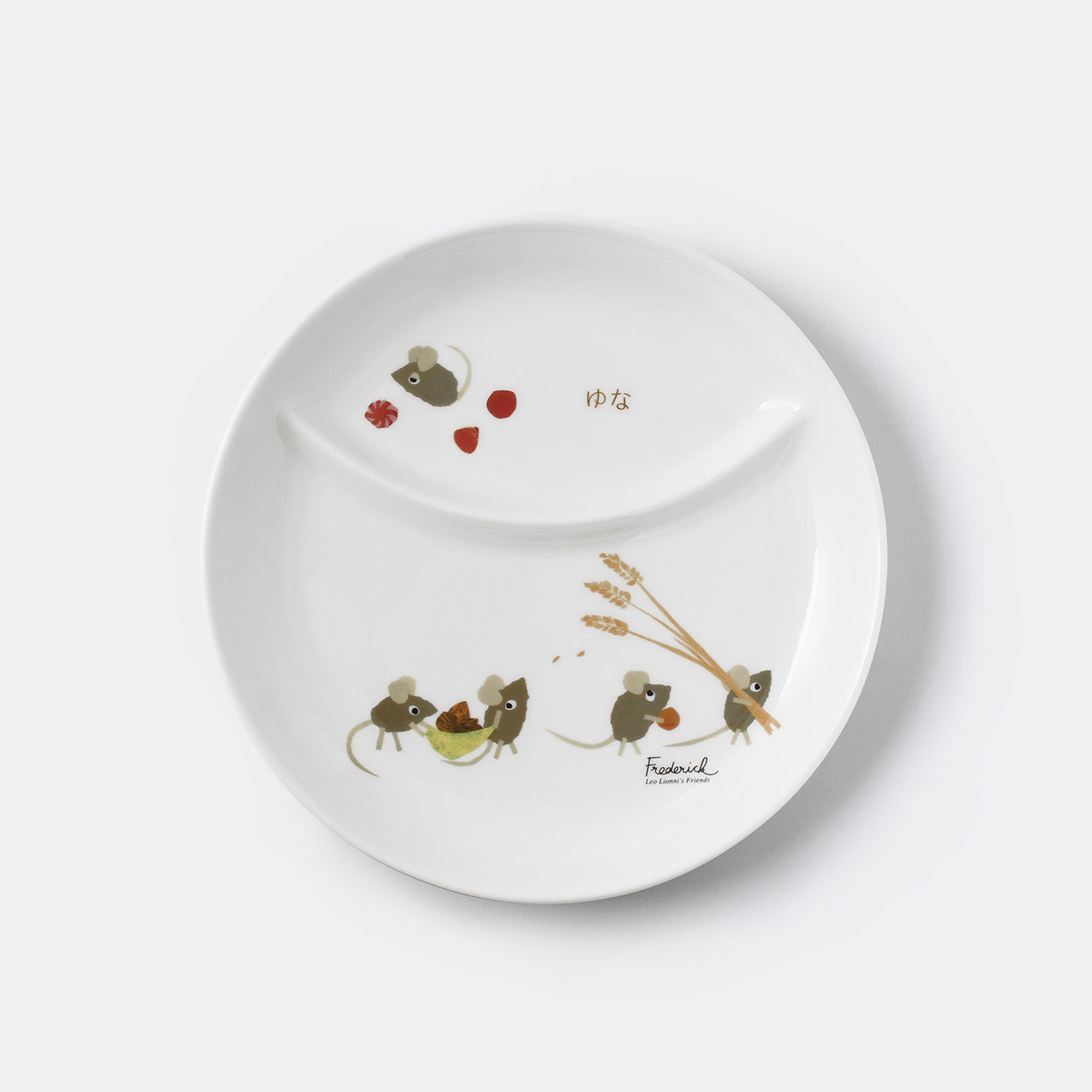レオ・レオニが描く「フレデリック」をモチーフにした、アート性の高いデザインの子供食器。「フレデリック」とその仲間たちと共に、楽しい食事の時間を過ごせます。 子供が大きくなった後も、ずっと長く使えるシンプルな形状の仕切皿。汁気のあるメニューでも混ざることなく、主菜と副菜を一皿で盛り付けられるので重宝します。オーブン・電子レンジの使用もOKな強化磁器製。