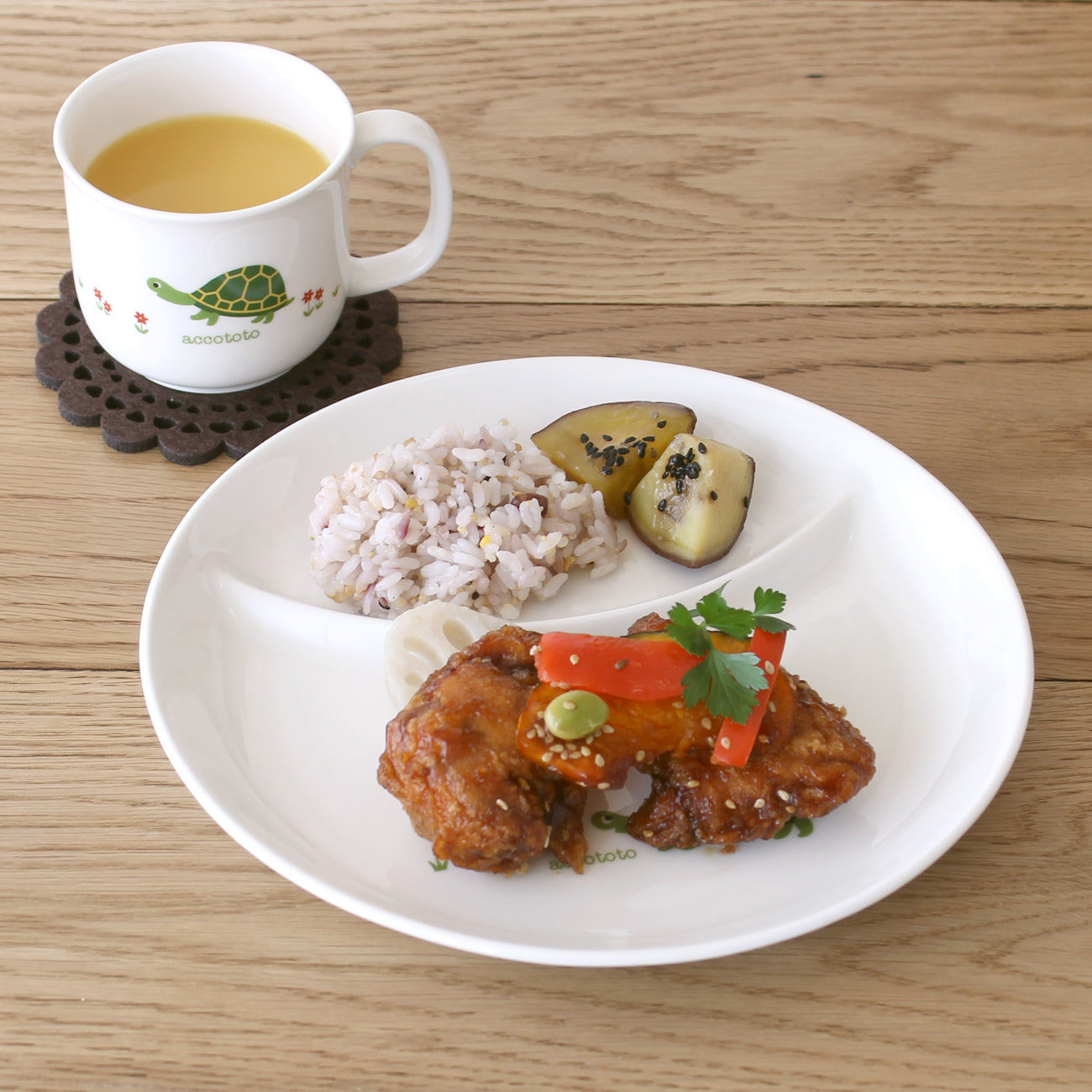 子供が大きくなった後も、ずっと長く使えるシンプルな形状の仕切皿。汁気のあるメニューでも混ざることなく、主菜と副菜を一皿で盛り付けられるので重宝します。オーブン・電子レンジの使用もOKな強化磁器製。