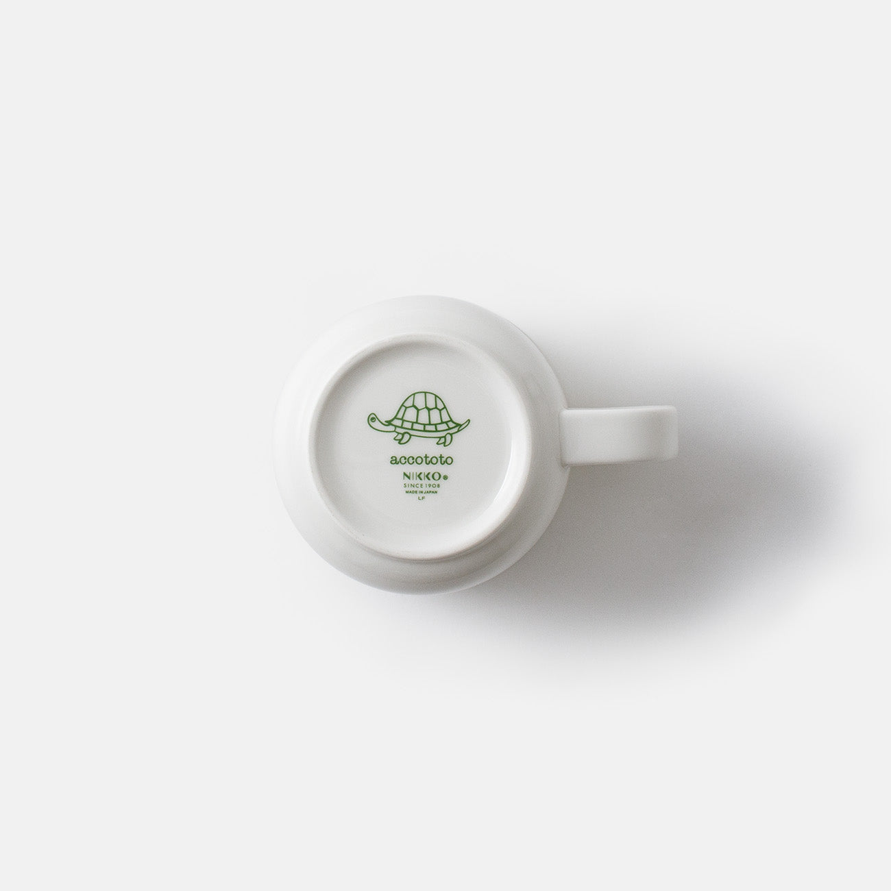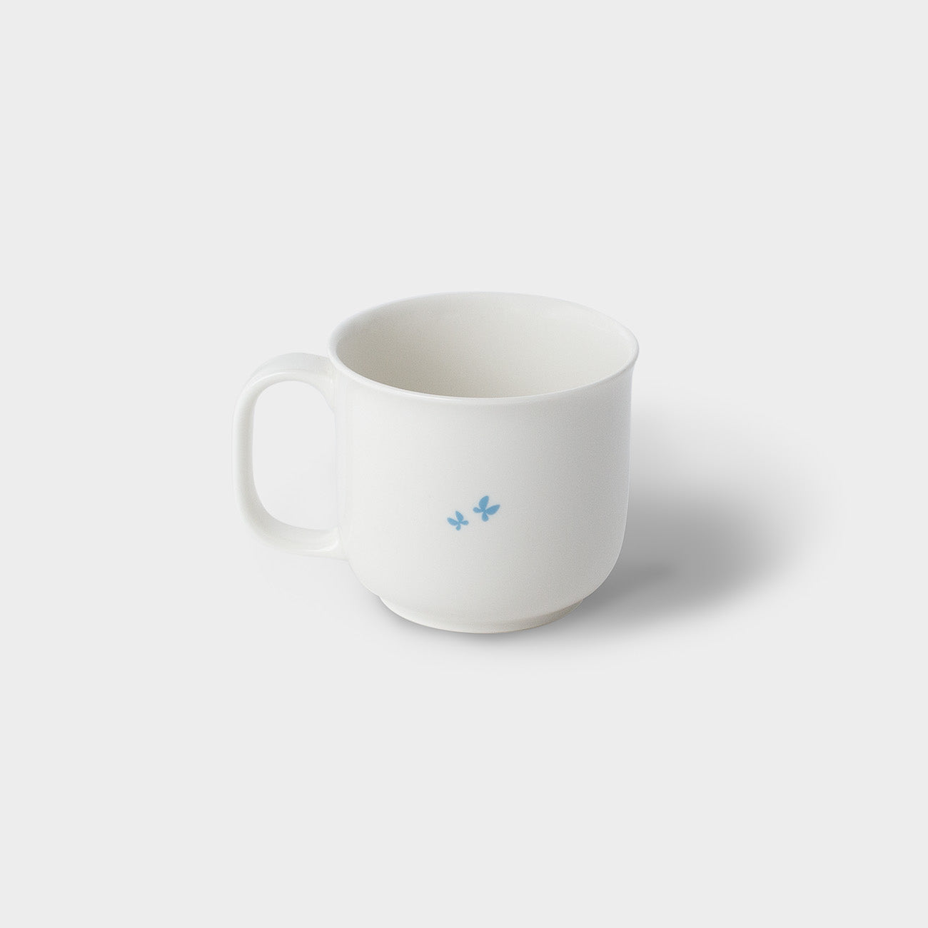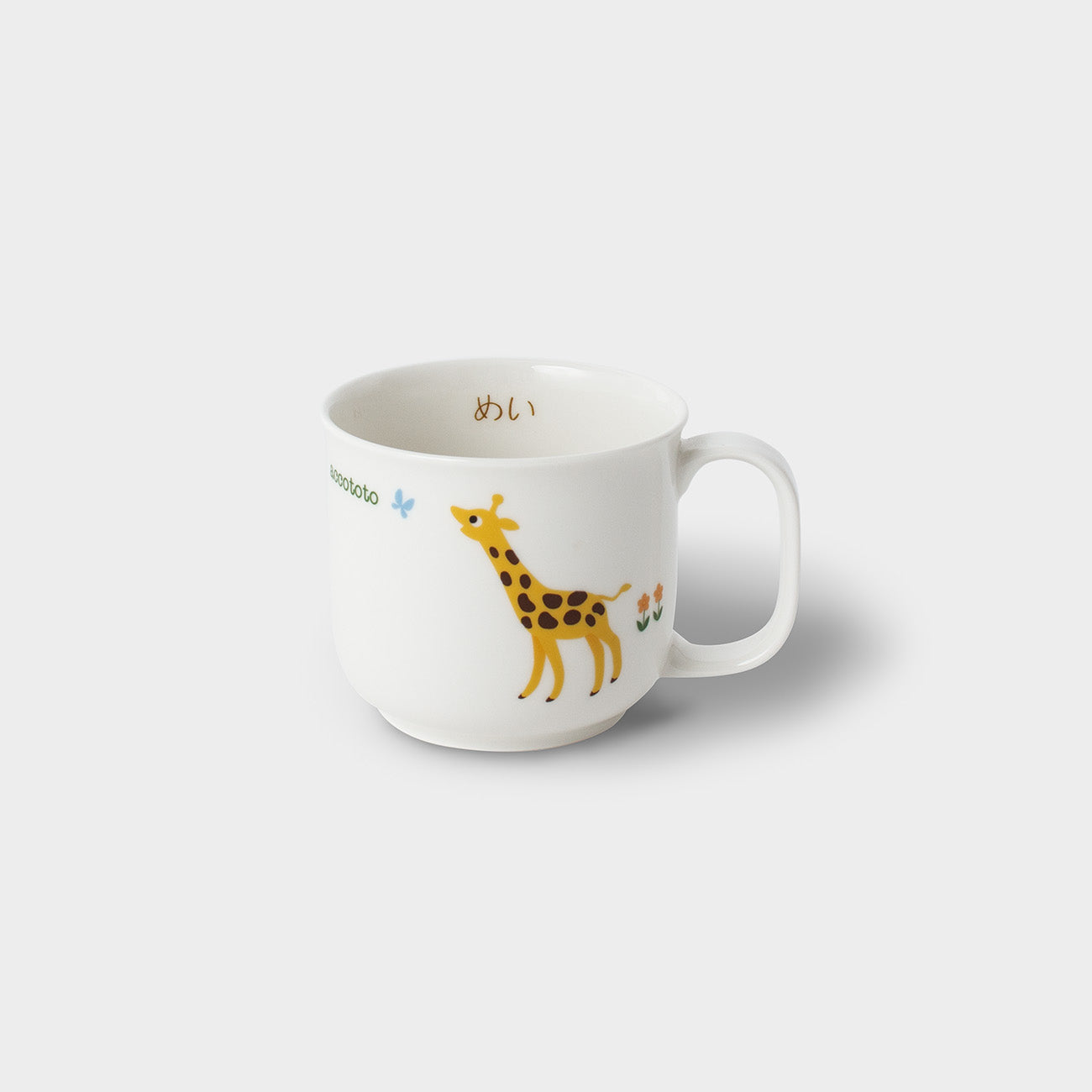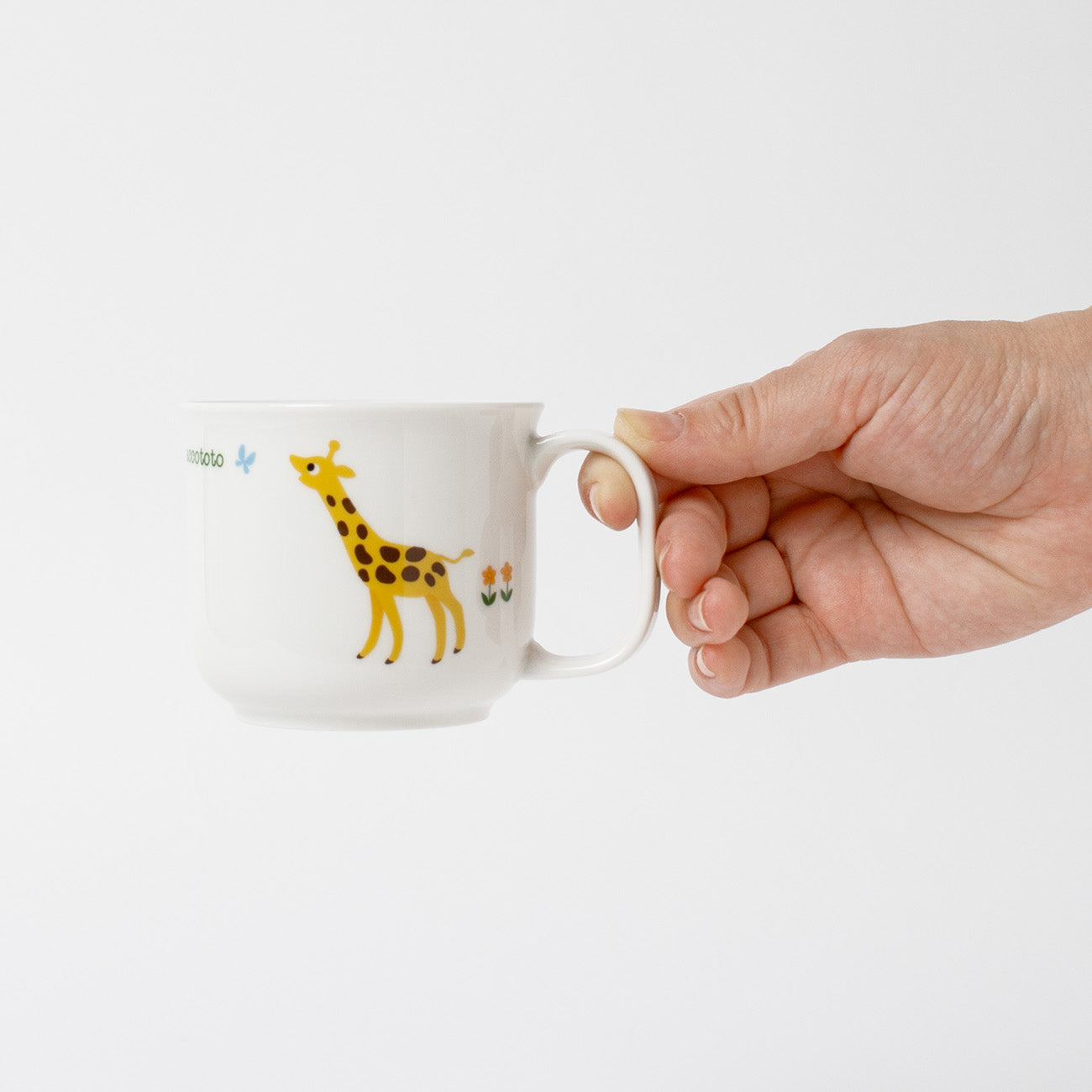 小さな子供でもしっかり持ちやすいハンドルの形にこだわりました。強化磁器製のマグは耐久性があるので、離乳食期から就学前頃まで、長い期間お使いいただけます。花びらみたいな蝶々を追っかけるキリンが、とてもかわいい!