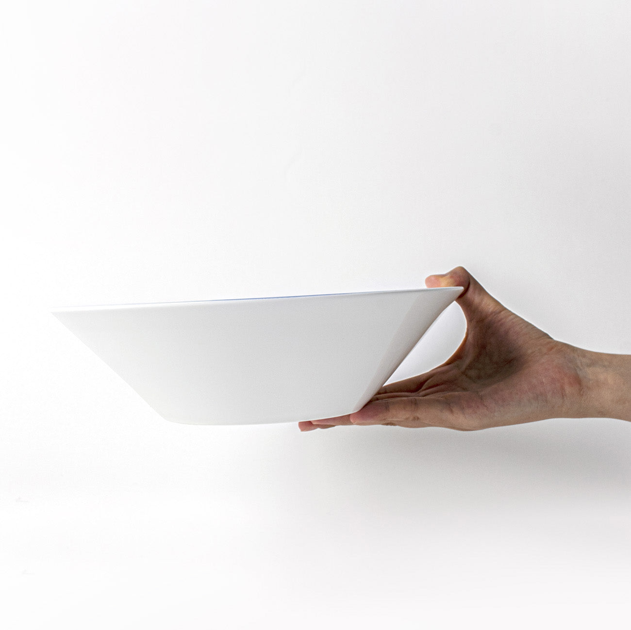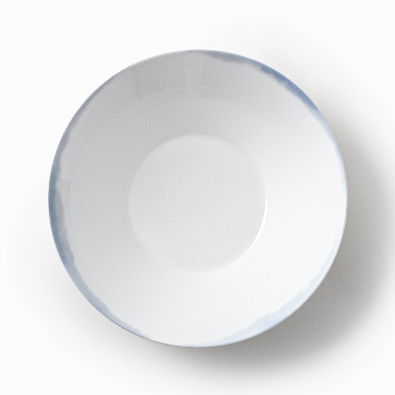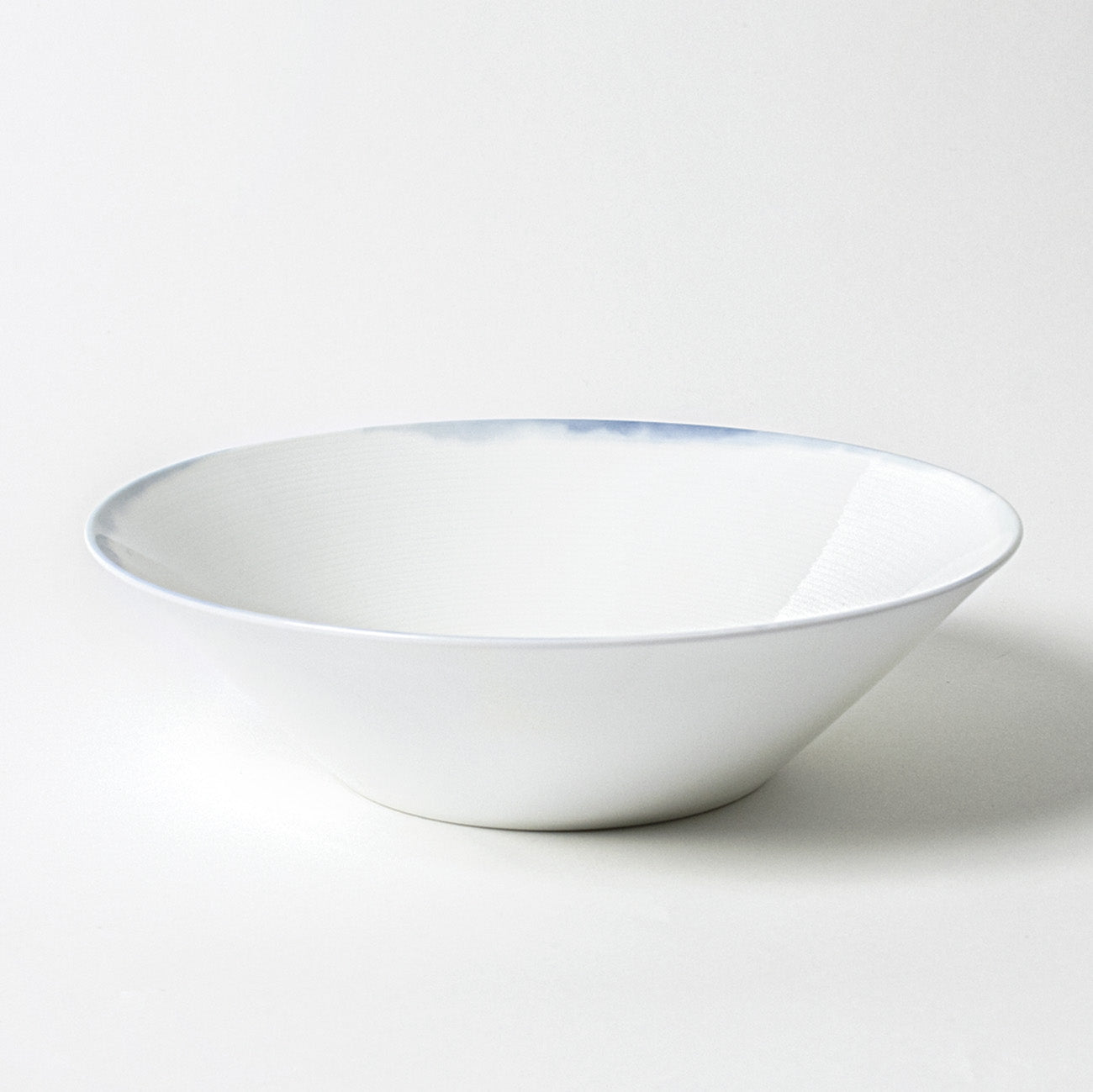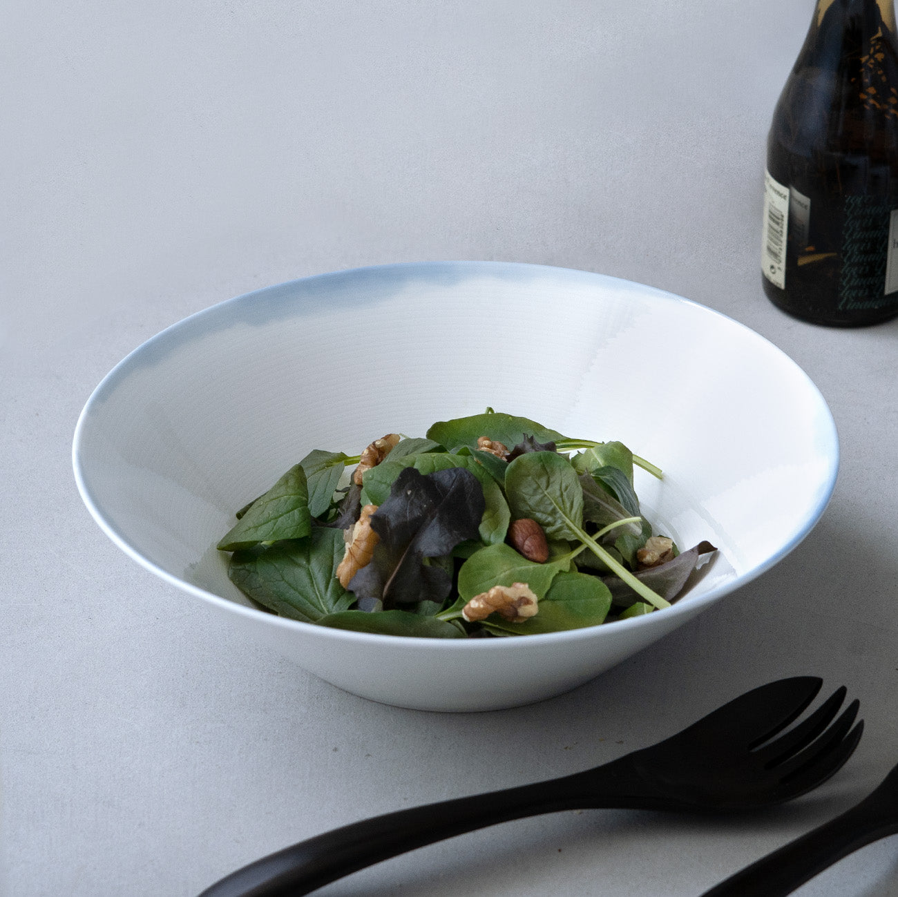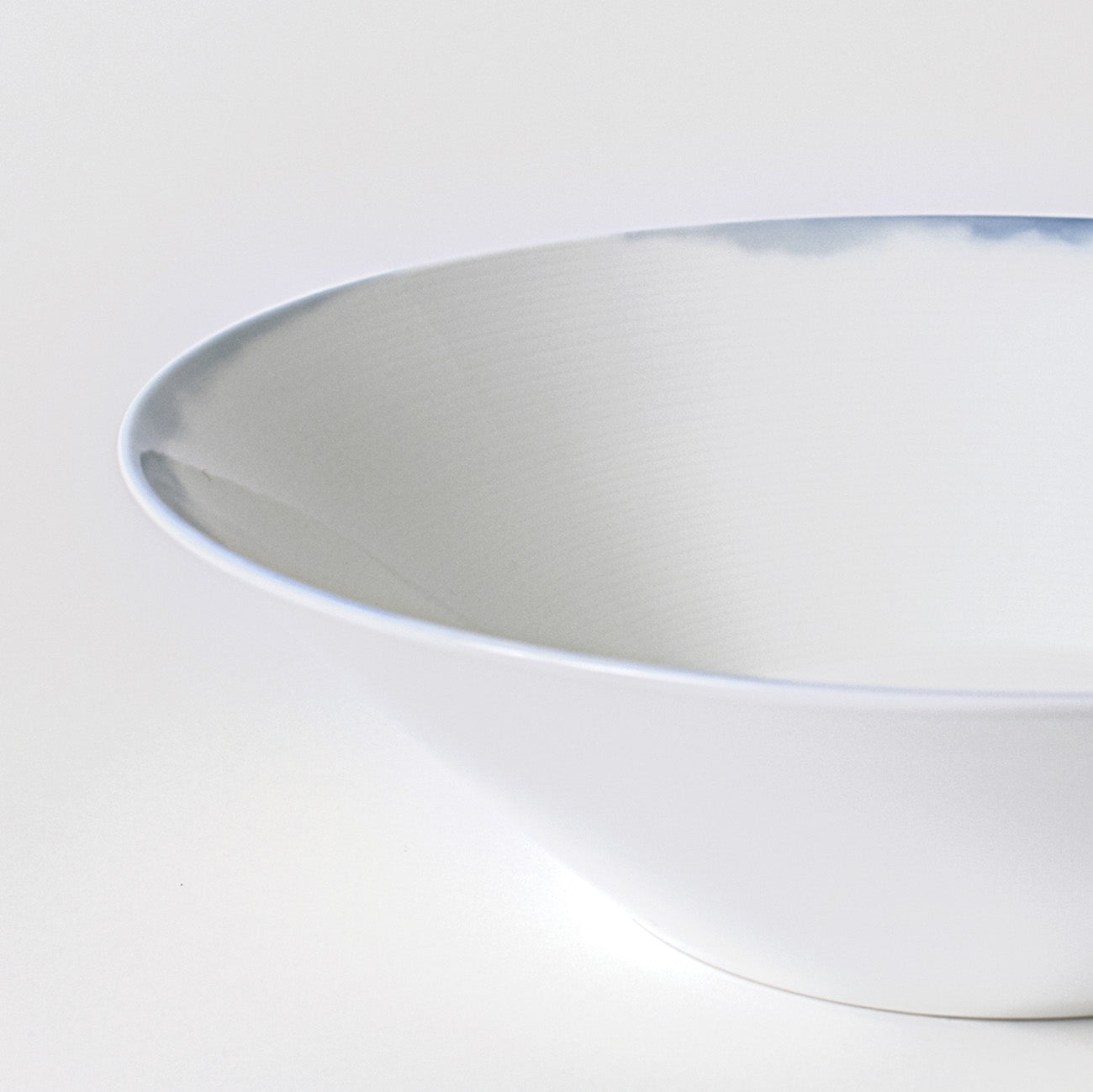 真っ白な素地に淡いブルーのラインが柔らかく広がるデザインです。盛り皿やサラダボウルとしてお使いいただけます。