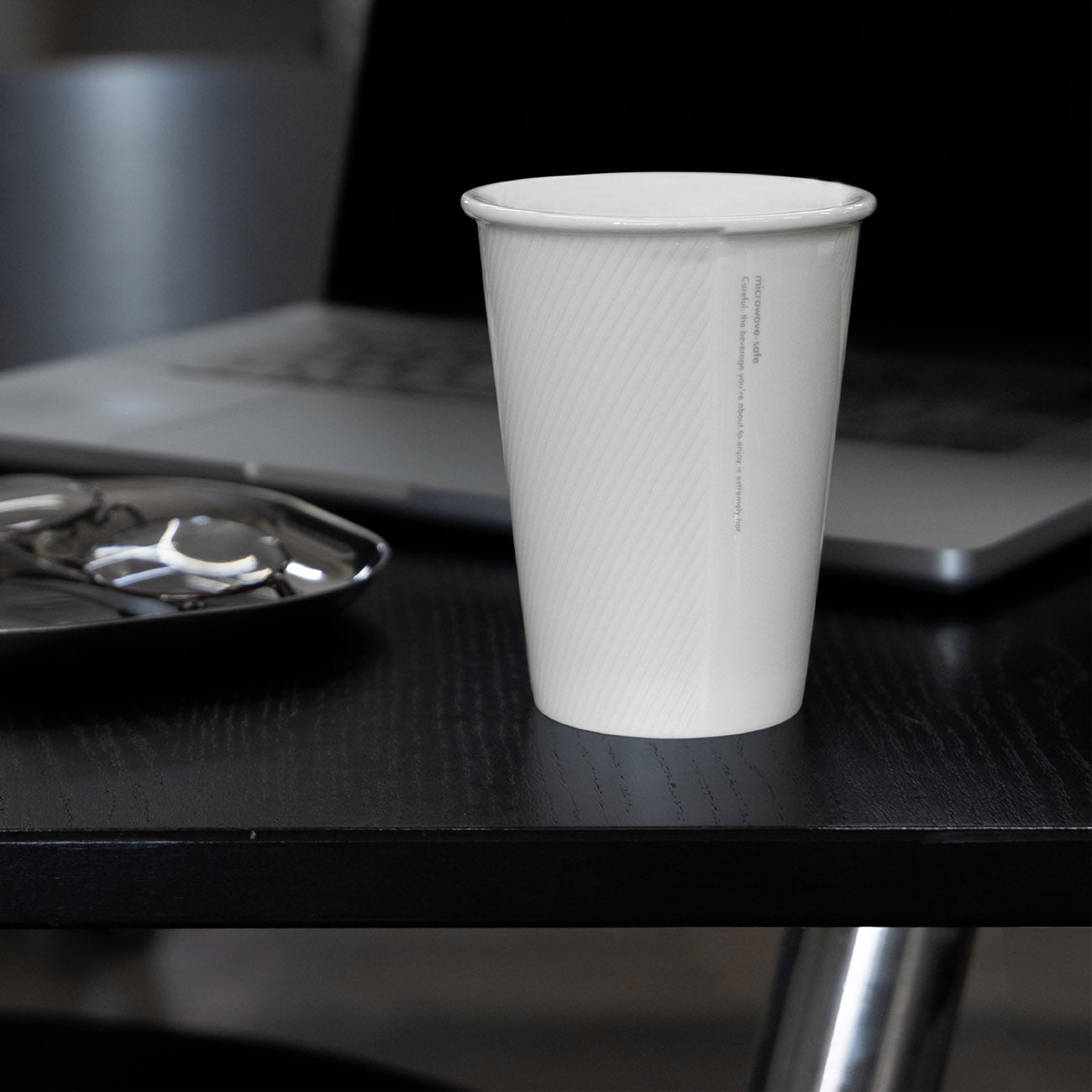 紙コップを模った形状にNIKKO FINE BONE CHINAならではの白さが際立つ、ユニークで美しいカップと専用スリーブのセットです。like a Paper Cup (鼓門):金沢駅のシンボル「鼓門(つづみもん)」に着想を得て、らせん状に組み上げられた柱の構造美を、シンプルにデフォルメしました。白の盛りとマットによる繊細な表現が上品なデザインです。