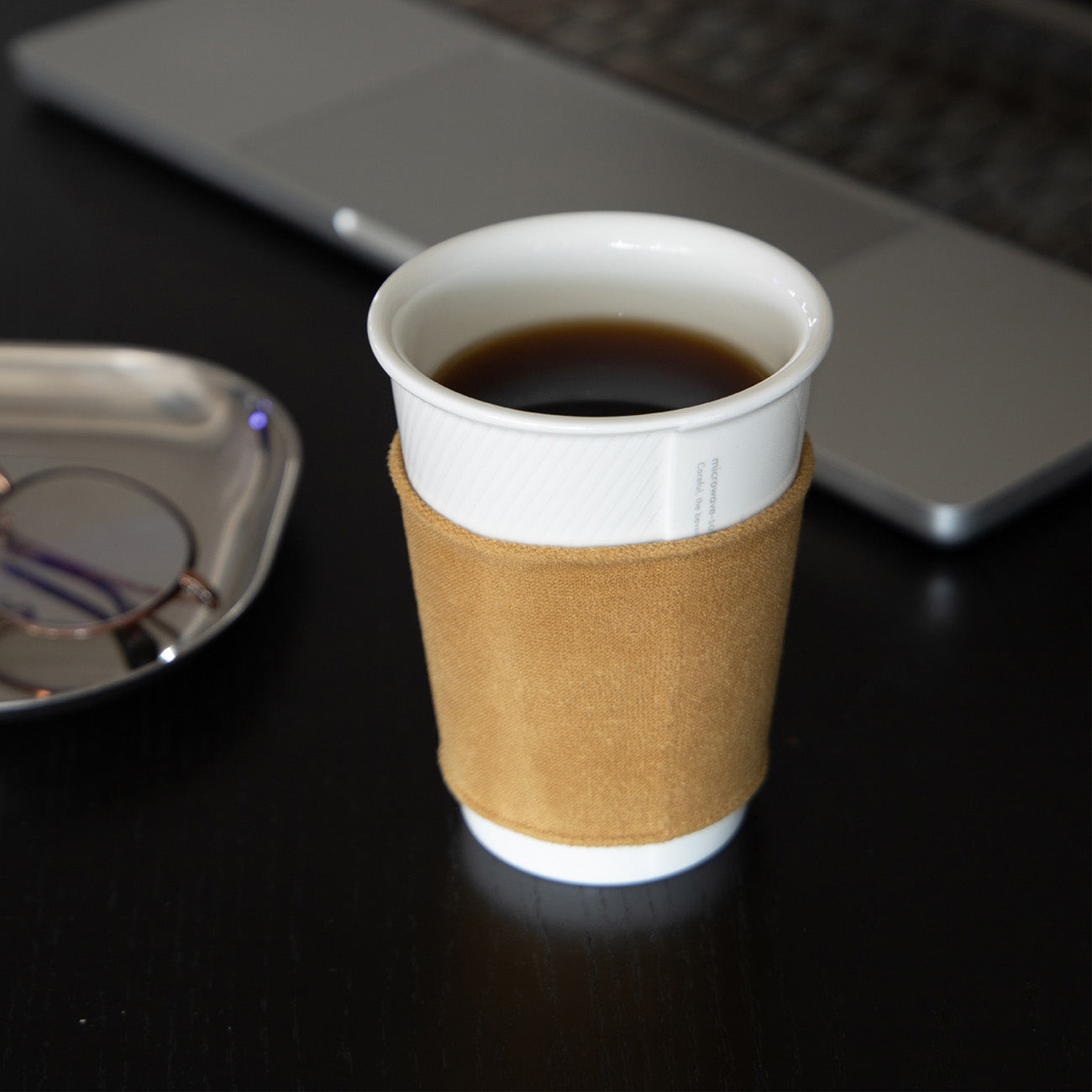 コーヒーを飲む際に使っている紙コップの代わりに、使い捨てしない陶磁器でできたカップを利用することで無駄を削減したいという思いを、このカップとスリーブに込めています。