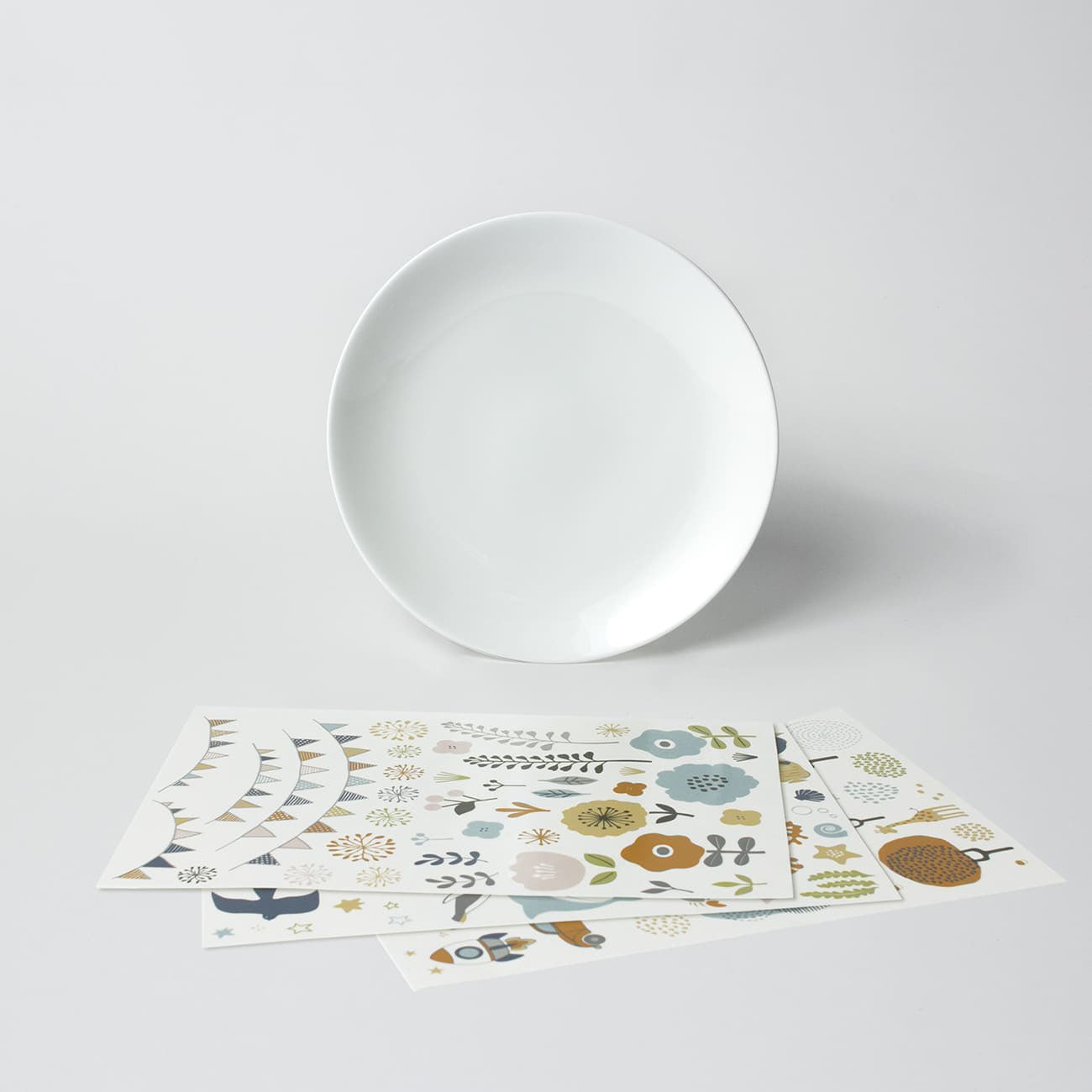 19cmプレート1枚、転写シールセット、転写シールを貼る道具がセットになっています。