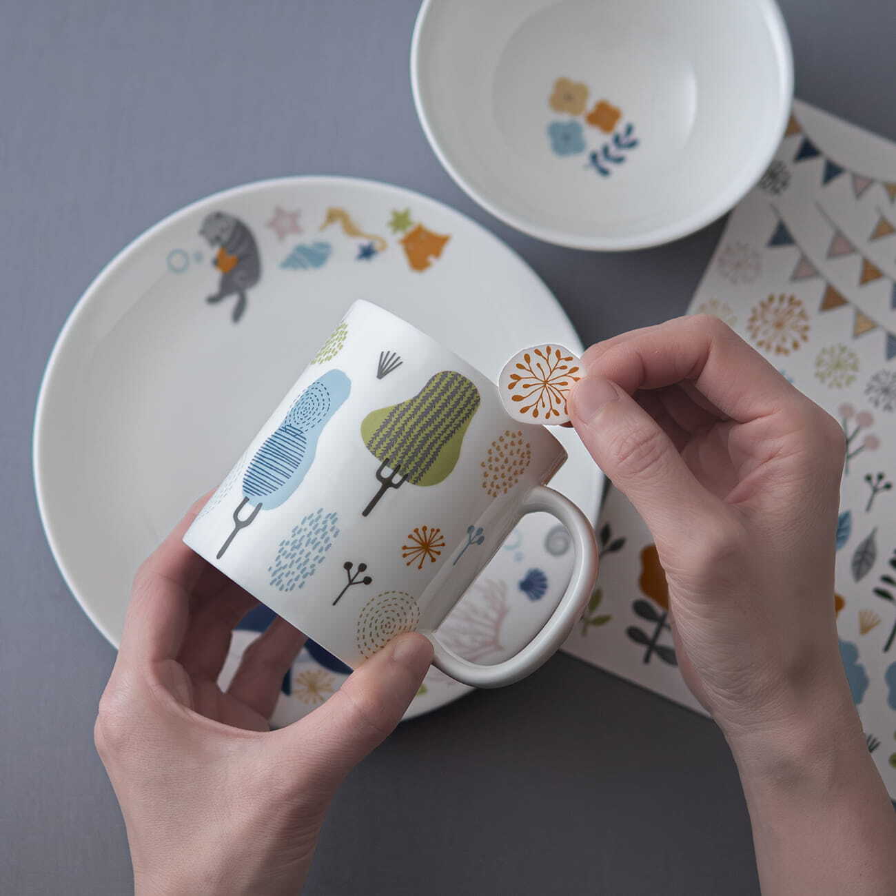 ニッコーの純白のボーンチャイナの器に、付属の転写シールを貼って自分だけのオリジナルデザインの器をつくることができます。