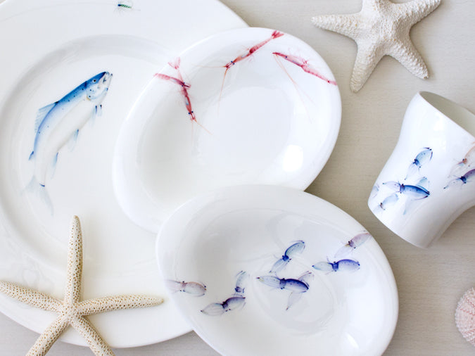 盛り付けると美しい曲線が映え、ワンランク上のおもてなしに重宝するオーバルプレートに、甘エビを描きました。■UMI 海シリーズ