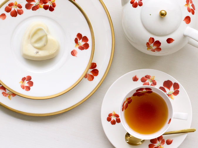 NIKKOハンドペイントの「HANA 花」シリーズ第1弾「ナスタティウム」。エディブルフラワーとしても人気のお花でアフタヌーンティーやお食事のシーンを華やかに演出します。五つ星最高級ホテルのラウンジでも使われている絵柄に、金をあしらいました。