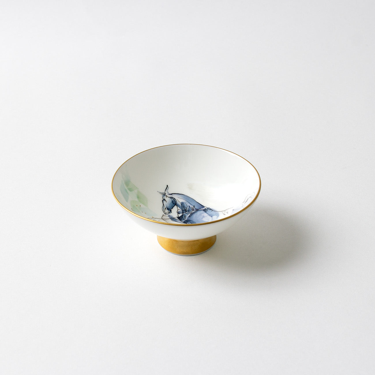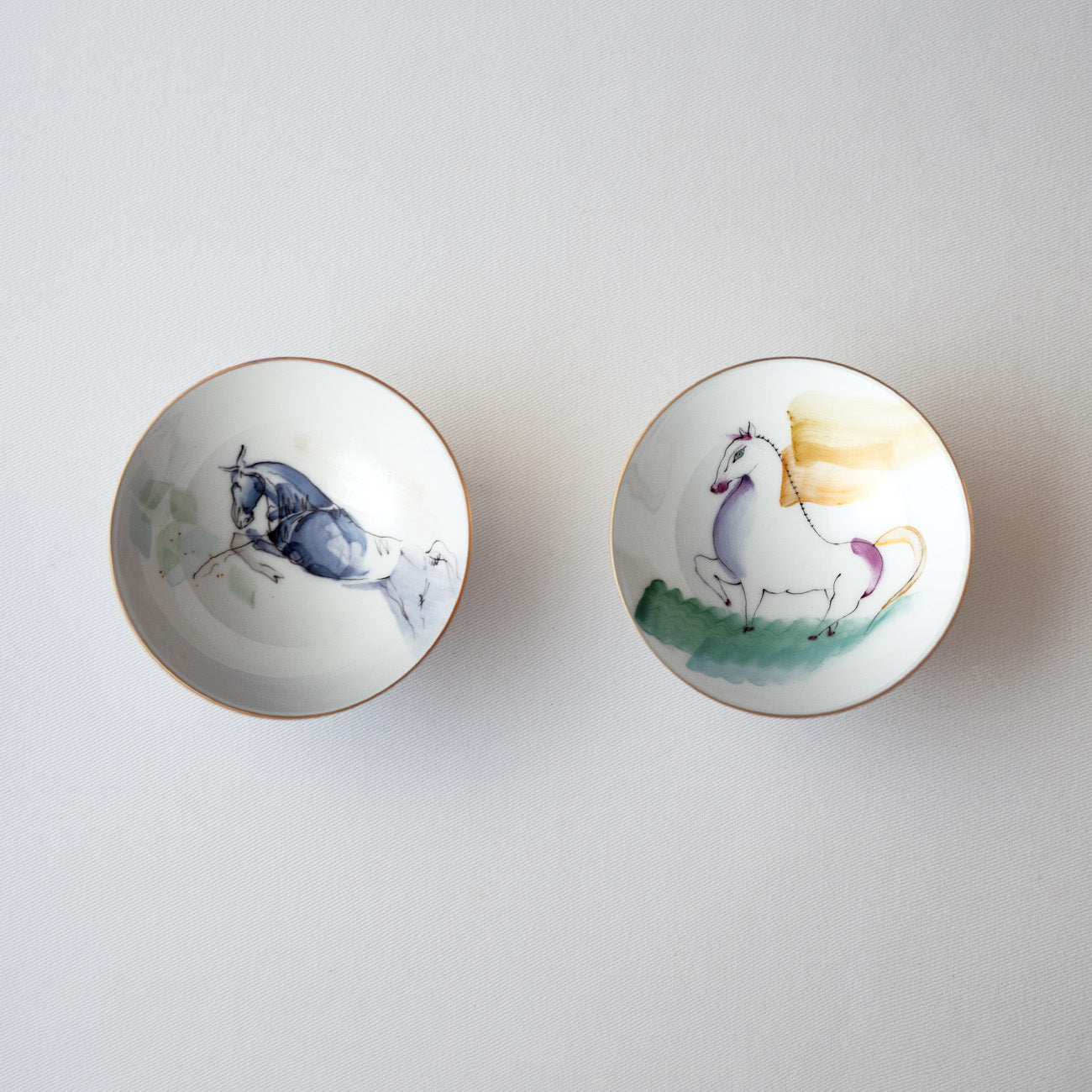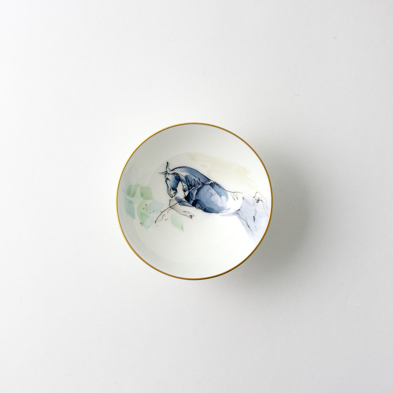 新たな年の飛躍を願い、颯爽と駆け上がる「午(うま)」をペインターが一筆一筆心をこめて描いた逸品です。瑞々しい透明感がハンドペイントならではの盃です。