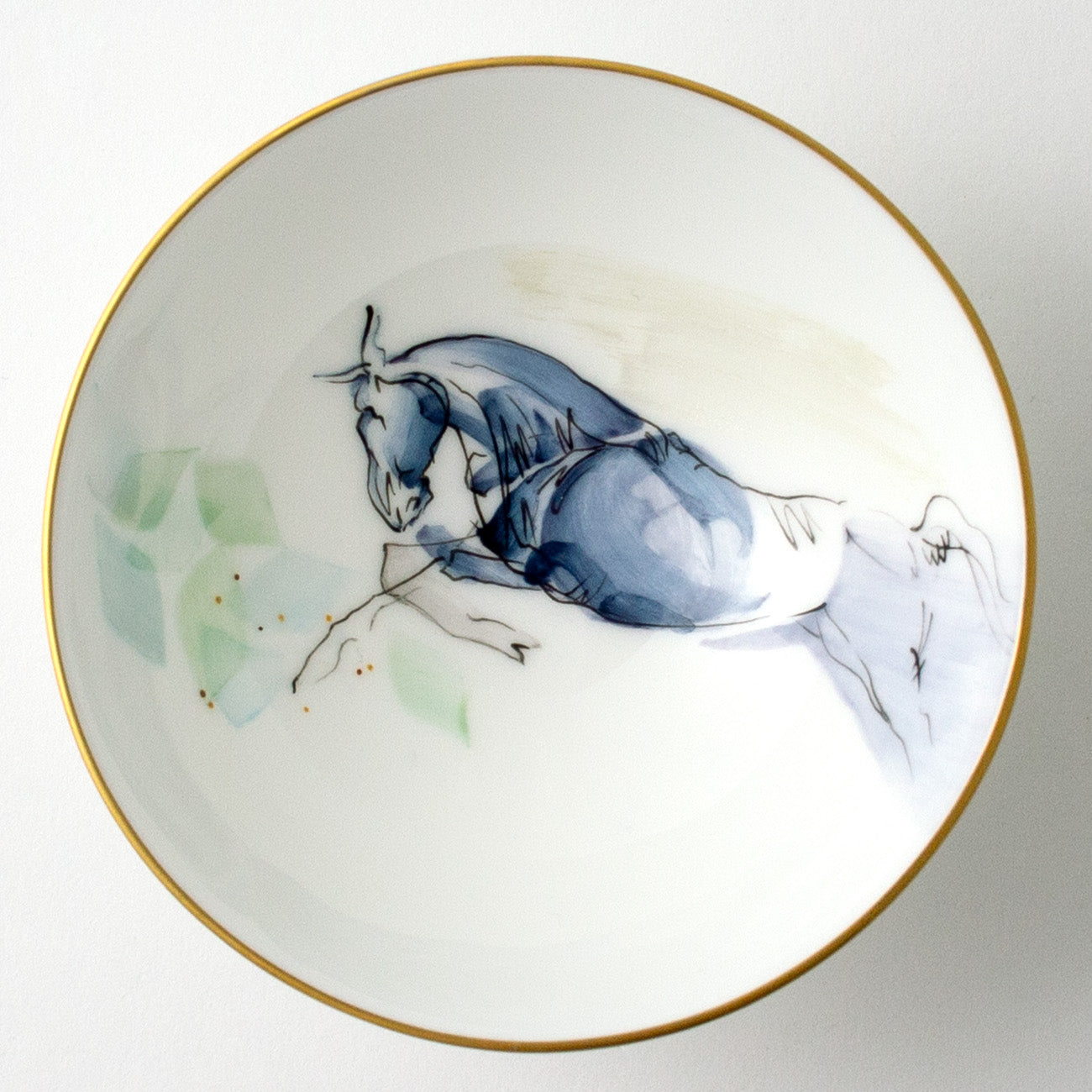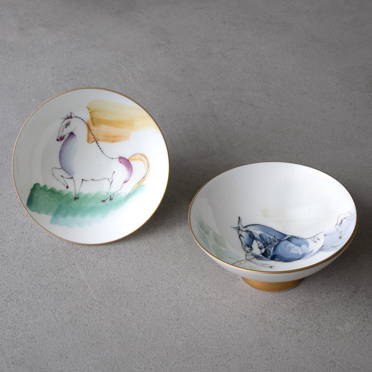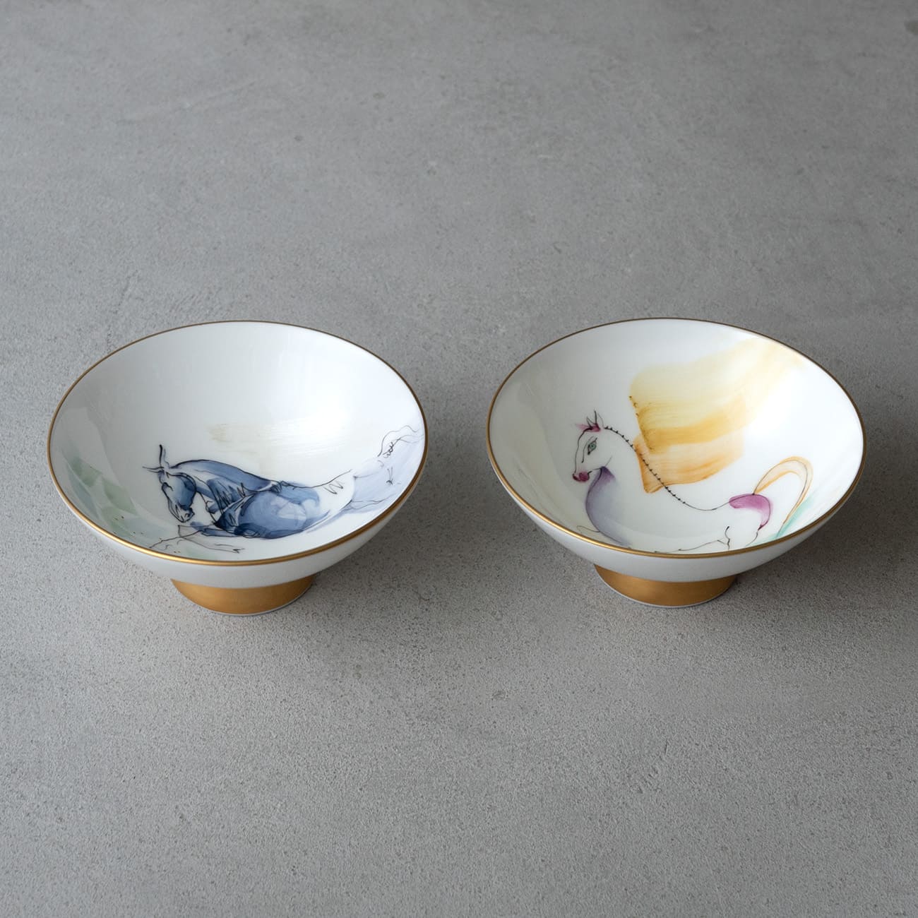 新たな年の飛躍を願い、颯爽と駆け上がる「午(うま)」をペインターが一筆一筆心をこめて描いた逸品です。瑞々しい透明感がハンドペイントならではの盃です。
